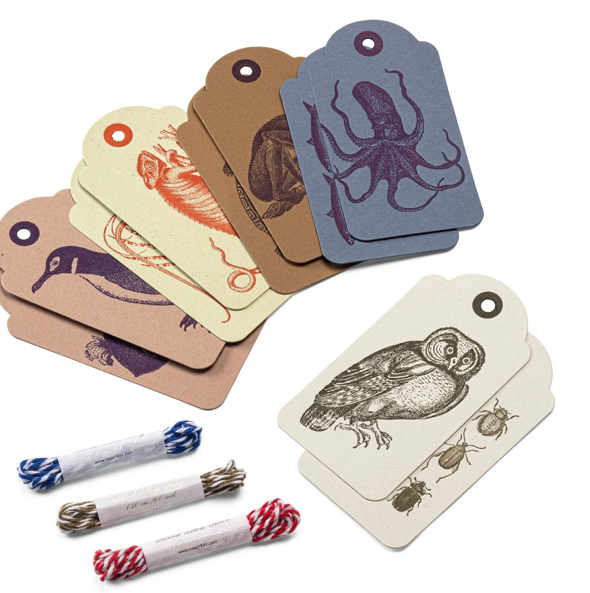 Für Leute, die sich noch angenehm kurz fassen (oder sehr klein schreiben) können: zehn bedruckte Anhängeetiketten mit Öse (im Zuschnitt klassischer Shipping Tags). Wir bieten die Etiketten im Set mit zehn verschiedenen Motiven historischer Tierzeichnungen an: Eule, Insekten, Pinguin, Dronte, Languste, Chamäleon, Affe, Schildkröte, Oktopus und Sardinen.