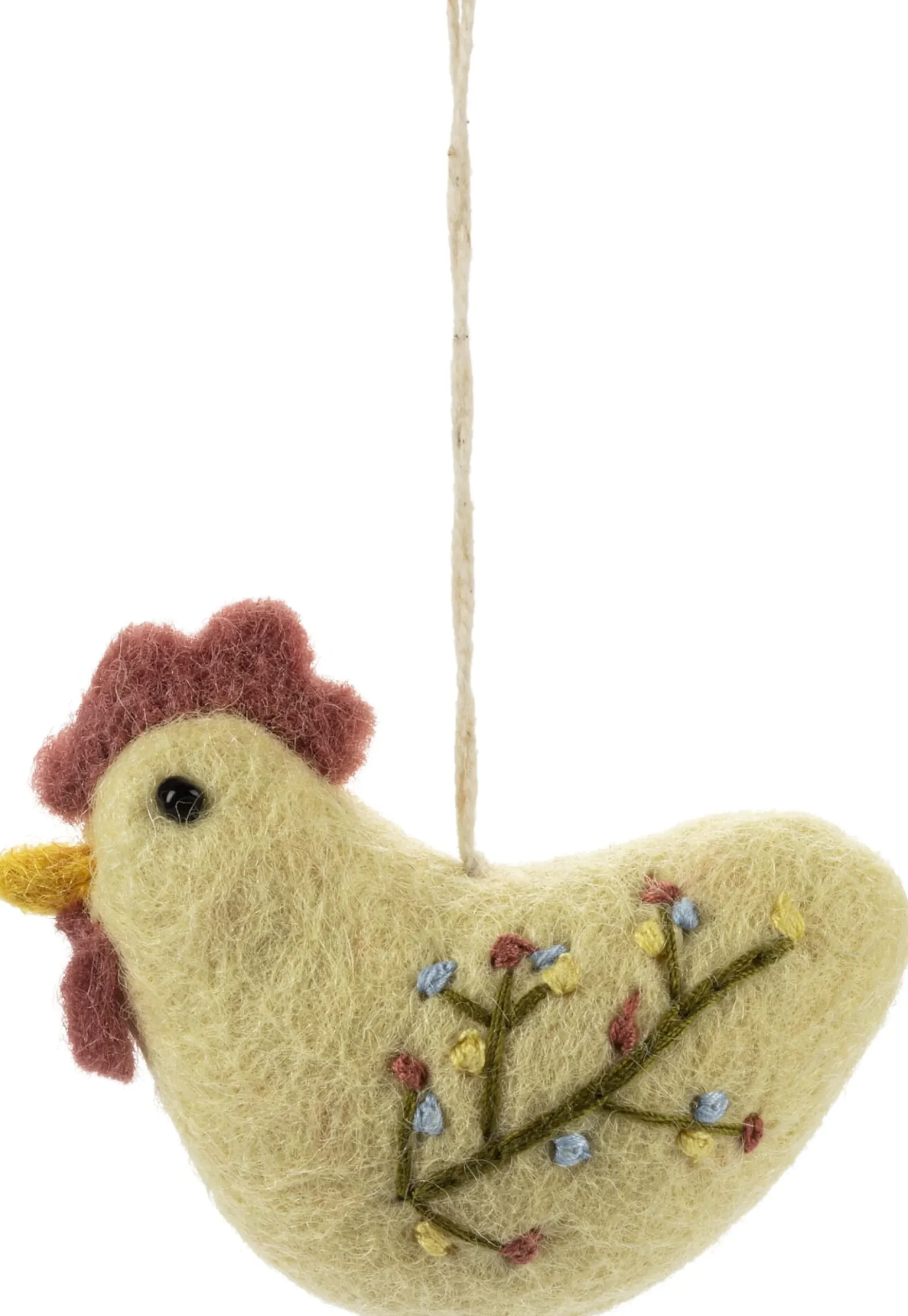 … wissen alle, dass bald Ostern ist. Ja, schon gut, der Reim schüttelt sich, doch der Hahn bleibt ungerührt, immerhin sind in Schweden Hahn und Küken für die Lieferung der Ostereier und Süßigkeiten verantwortlich. Die schwedische Osterhahn-Tradition hat die dänische Designerin offensichtlich aufgegriffen und diese kleinen Hähnchen-Anhänger ins dekorative Leben gerufen. Von Hand aus reiner neuseeländischer Schurwolle gefilzt, beeindruckt der kleine Hahn durch seine Beständigkeit und wird Ihren Osterschmuck auch langfristig, wenngleich nicht krähend, so doch farbenfroh bereichern. Umsichtig von Hand aufgestickt, weckt sein florales Muster Frühlingslaune und setzt bunte Tupfer in Ihre Osterzweige, Fensterdekoration oder auch auf Ihre Sonntagstafel.