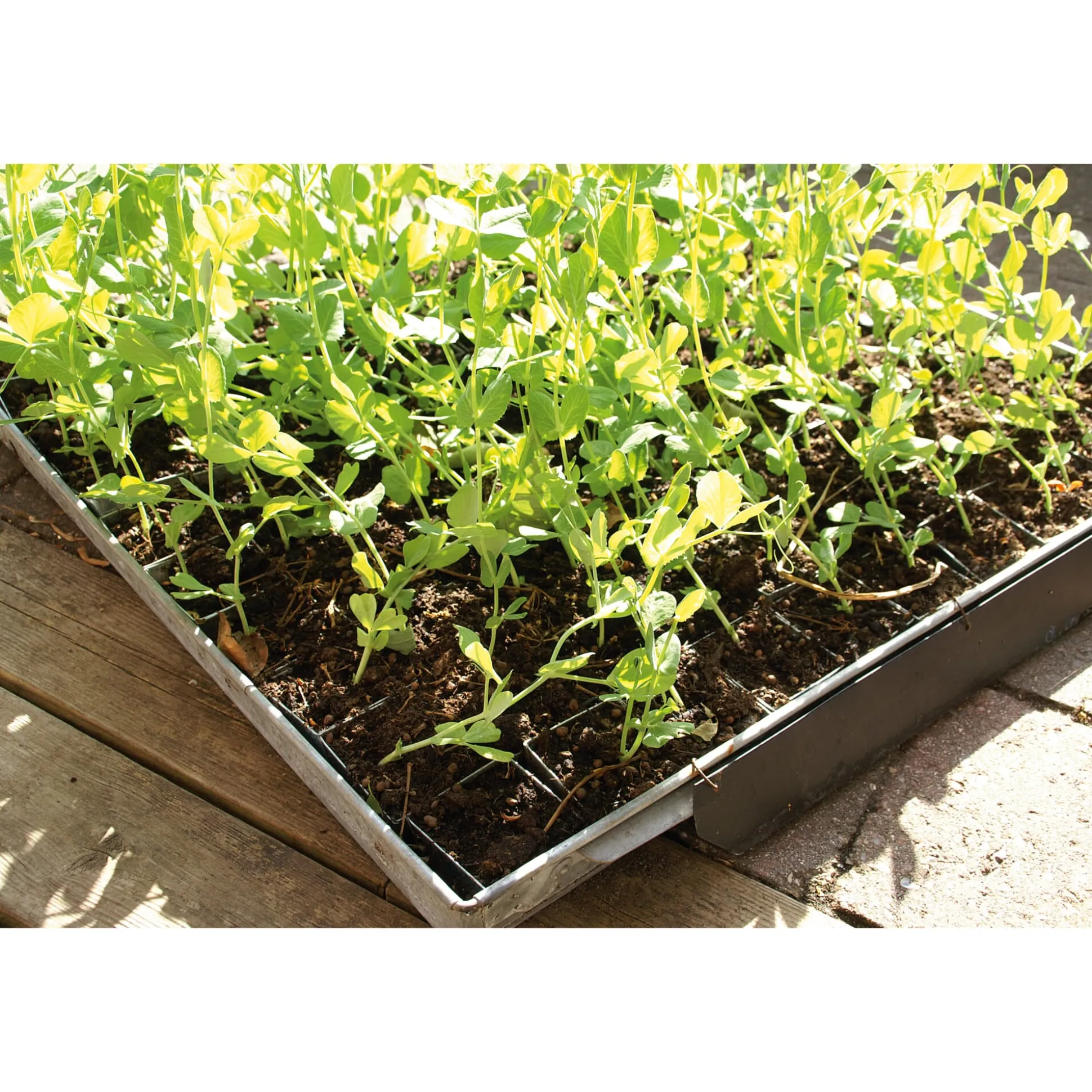 Bei der Jungpflanzen-Anzucht leistet es gute Dienste: Dieses „Tablett“ mit erhöhtem Rand kann je nach Ausführung bis zu 70 kleine Rahmen aus Stahl (Einzeltöpfe ohne Boden) aufnehmen. Es wird mit Erde befüllt, damit direkt hineingesät werden kann. Stecklinge oder vereinzelte Jungpflanzen lassen sich ebenfalls einsetzen. Da die Rahmen nur lose auf der Platte stehen, können sie jederzeit leicht entnommen werden, ohne dass dabei die empfindlichen Wurzelballen beschädigt würden; die konische Form erleichtert das Herausdrücken der Ballen im Ganzen – und somit auch das Umpflanzen in Beet oder Topf.