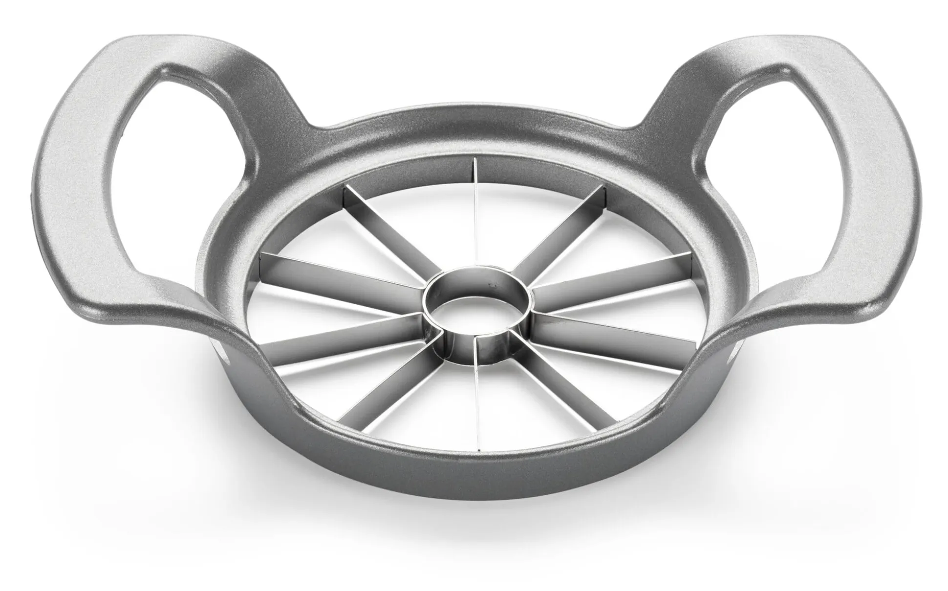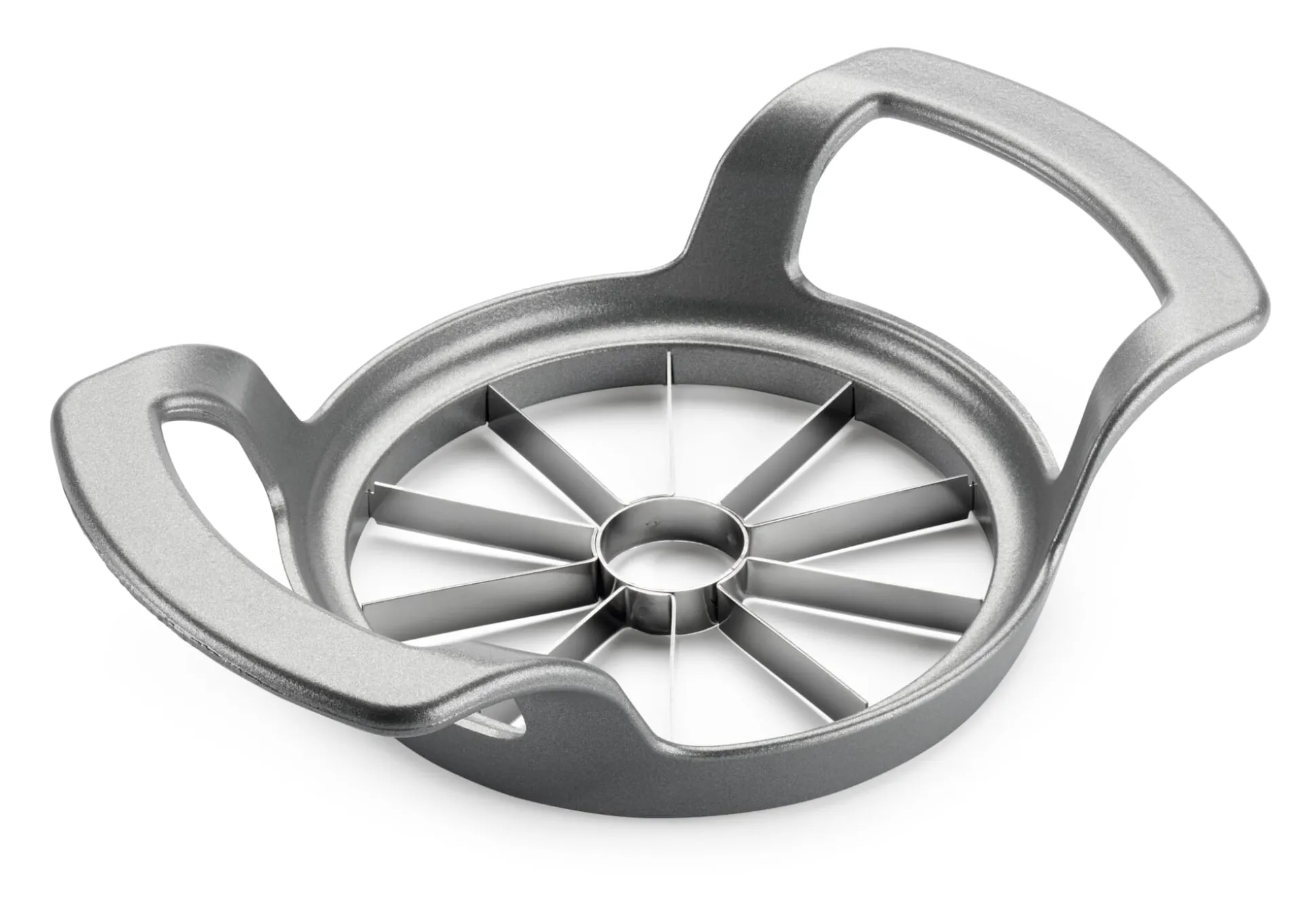 Entkernen und Schneiden. Der Apfelteiler zerteilt Äpfel (oder Birnen) in zehn gleich große Spalten und trennt dabei noch das Kerngehäuse heraus.