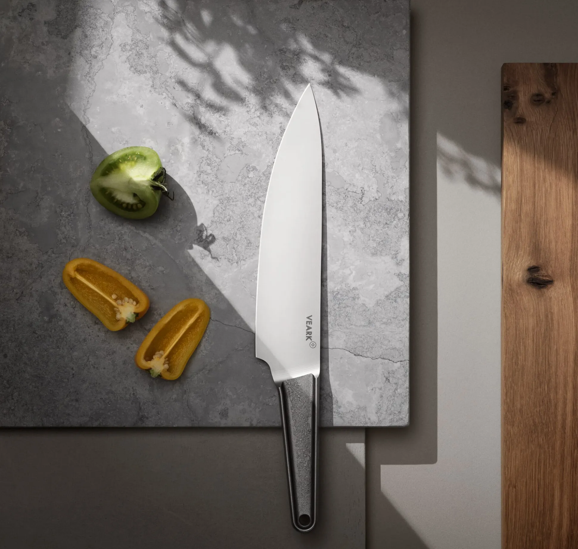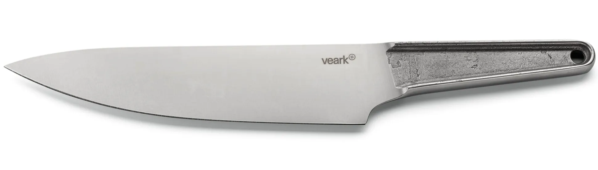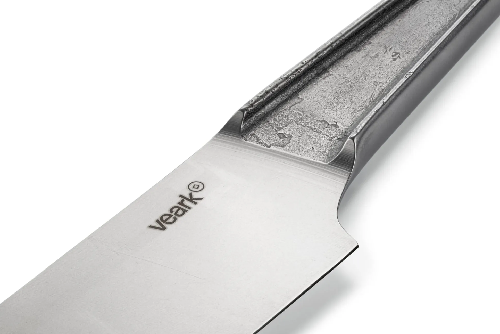 Bildschöne Werkzeuge – beste Arbeitsgeräte. In der Tradition geschmiedeter Metallwerkzeuge. Die Messer von VEARK besitzen eine überzeugende Ästhetik und stehen in ihrer Qualität ihrer Optik nicht nach. Die in Dänemark entworfenen und als Monoblock konstruierten Messer werden in Solingen aus bestem Klingenstahl gesenkgeschmiedet. Dieser Stahl besteht aus den Legierungsbestandteilen Kohlenstoff, Chrom, Molybdän und Vanadium. Das macht die Messer im hohen Maße beständig gegen Korrosion und vor allem lassen sie sich besser und schärfer schleifen, denn sie besitzen eine für Messerstahl überdurchschnittliche Härte von 58 Rockwell. Das bedeutet: Ein härteres Messer kann schärfer geschliffen werden und die geschliffene Klinge hält länger. Damit bleibt die sogenannte Schnitthaltigkeit länger erhalten. Die Messer von VEARK liegen ausgewogen in der Hand, dank ihrer Symmetrie Rechts- und Linkshändern gleichermaßen. Die rohlinghaften, markanten Griffteile haben nicht nur eine einzigartige, industrielle Ästhetik, sondern lassen sich auch gut greifen und handhaben. Schönes Detail: Das Schmiedeverfahren hinterlässt ein individuelles Muster auf dem Griff und macht jedes Messer zum Unikat.
