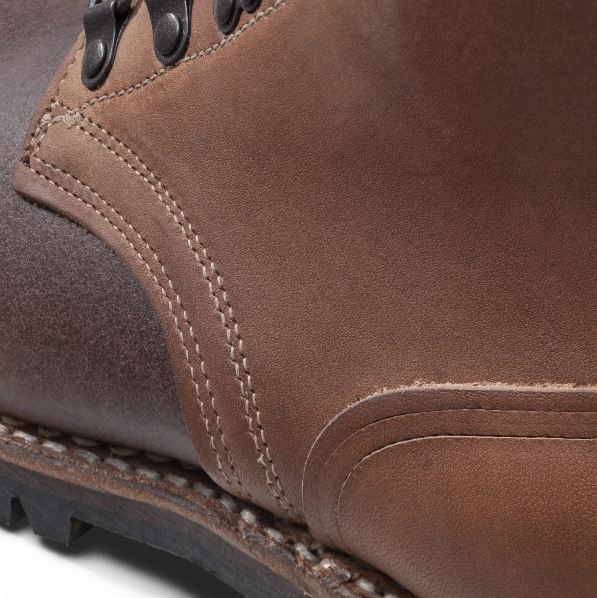 Obermaterial Rindleder (Stärke 2,5–3 mm), vegetabil gegerbt. Vorderkappe mit Kalbleder gefüttert. Brandsohle Rindleder, vegetabil gegerbt. Ausballmasse Filz, Zwischensohle Gummi. Profilierte Gummilaufsohle aus deutscher Fertigung. 3 Haken-, 2 Ösenpaare. Hergestellt in Deutschland.