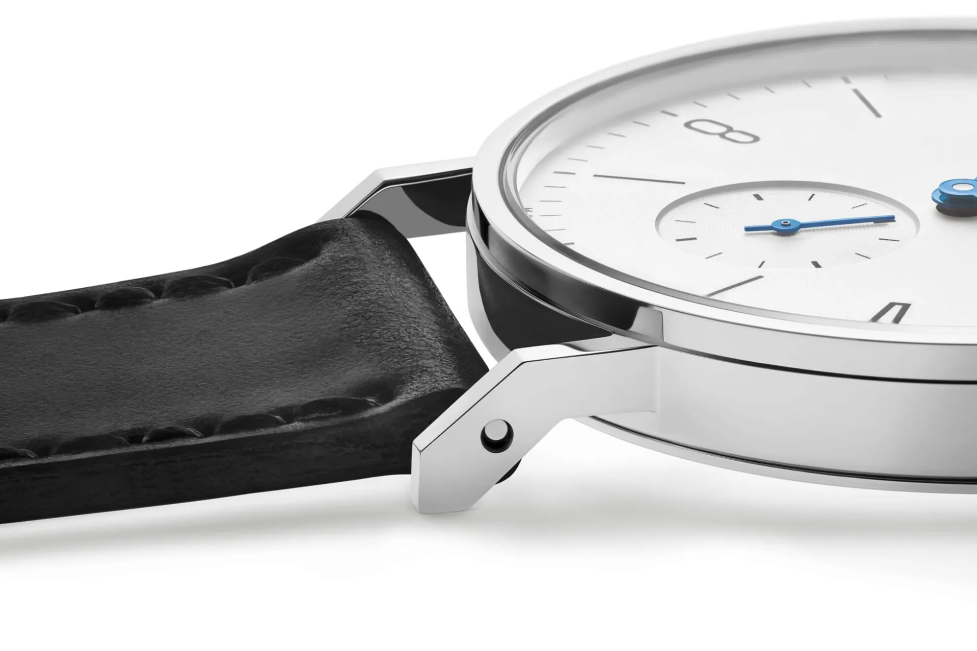 Handaufzugwerk Alpha (17 Rubinlagersteine, 43 Stunden Gangreserve). Zifferblatt galvanisiert, weiß versilbert, Zeiger temperaturgebläut. Saphirglasabdeckung. Gehäuse (Ø 35 mm, Höhe 6,2 mm) aus poliertem Edelstahl mit Stahlboden. Druckfest bis 3 bar. Schwarzes Cordovan-Lederarmband, Anstoßbreite 18 mm. Gewicht mit Armband 38 g.
