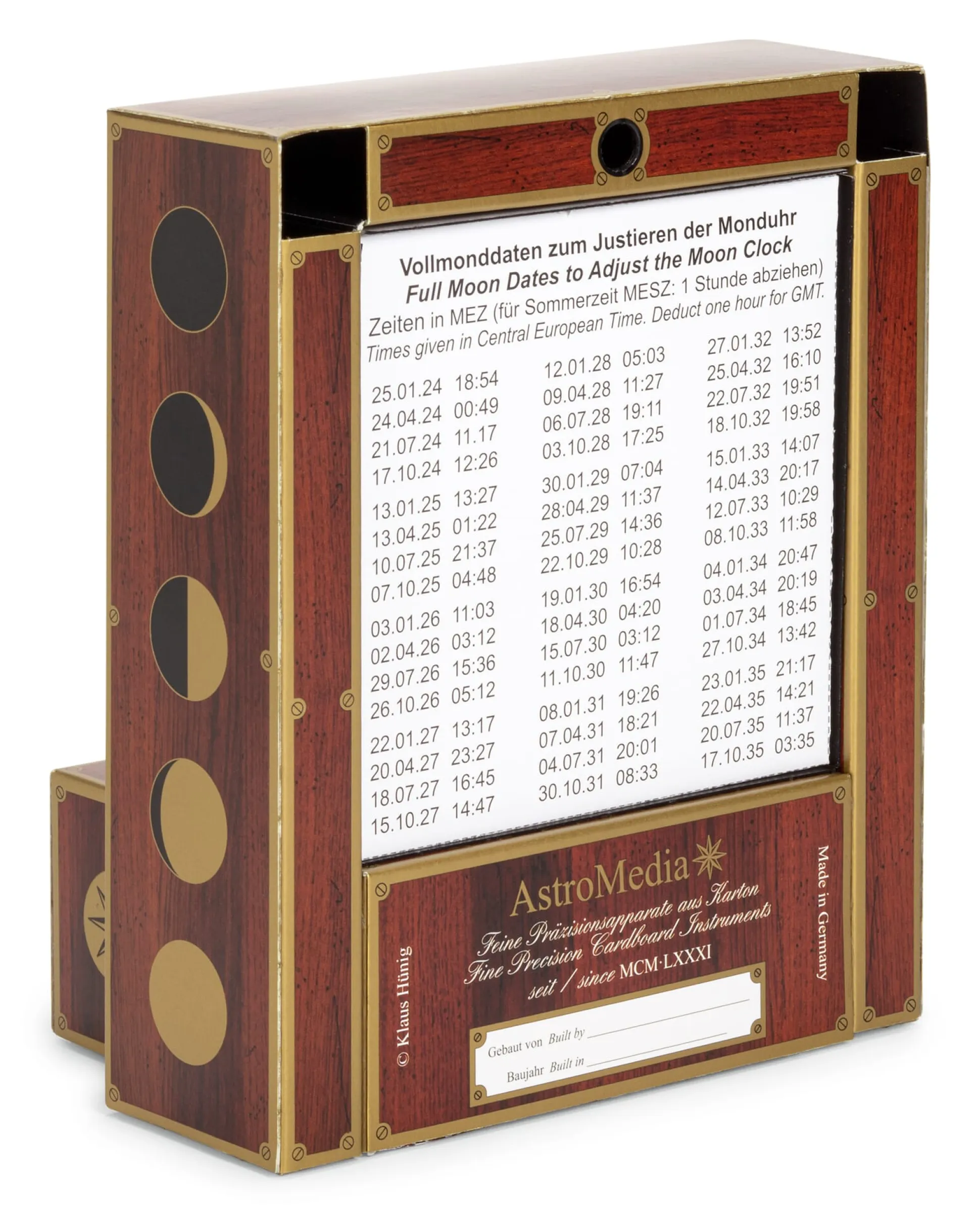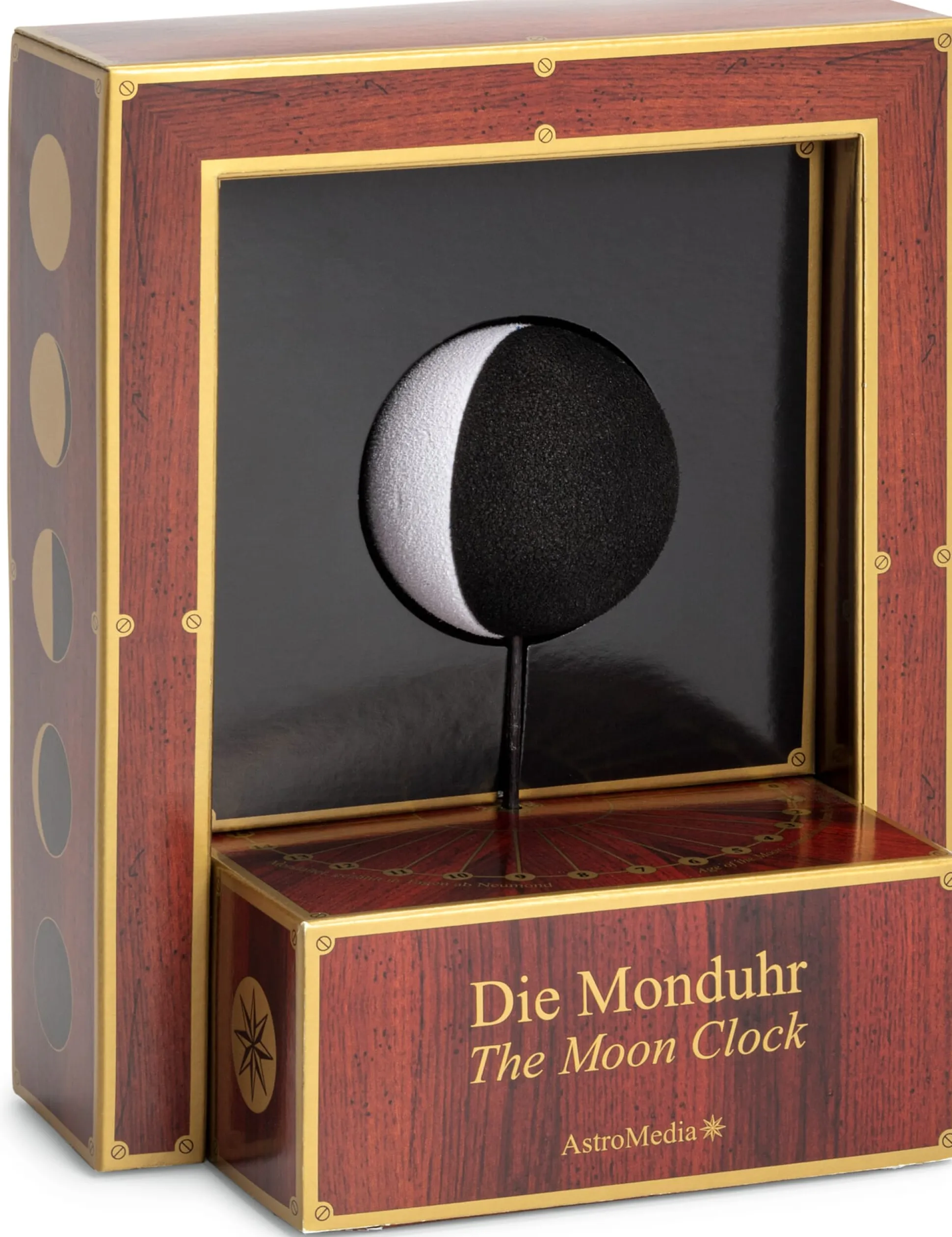 Der Zusammenbau der AstroMedia Monduhr ist recht einfach und laut Herstellerangabe binnen vier bis fünf Stunden zu meistern. Nach dem Vorbild der großen mittelalterlichen astronomischen Uhren, wie sie beispielsweise heute noch im Straßburger Münster und im Amalientrakt der Wiener Hofburg zu sehen sind, verwendet diese Monduhr eine Kugel zur Darstellung der jeweiligen Mondphase. Im Unterschied zur zweidimensionalen Darstellung einer Armband- oder Wanduhr zeigt die schwarz-weiße Kugel, vis-à-vis betrachtet, die Schatten-Licht-Grenze des Halbmondes nicht als Bogen, sondern als Gerade an, wie sie tatsächlich auf dem Himmelsmond erscheint.