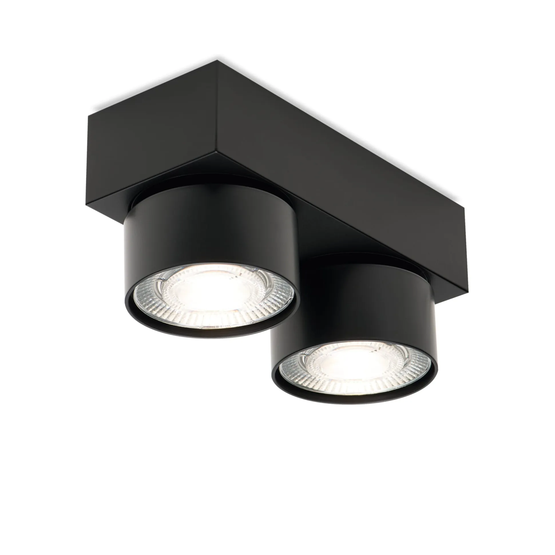 Vielseitig einsetzbarer Aufbaustrahler zur Akzentbeleuchtung. Die um 365 Grad drehbaren und 90 Grad zu schwenkenden Strahlerköpfe sitzen auf dem rechteckigen Gehäuse auf. Mit einem Griff lässt sich der gesamte Lichtkopf dank eines patentierten Bajonetts zur Wartung vom Gehäuse lösen. Aufwendiges Gehäuse, schön gefertigt, ohne sichtbare Schrauben und Kabel. Der Lichtaustrittswinkel der Leuchtmittel liegt bei 12 Grad und erzeugt damit ein punktuelles Licht. Im Lieferumfang enthalten sind zwei Aufsatzlinsen, deren Einsatz einen Lichtausfall von 38 Grad erzeugt und damit breit abstrahlt. Die Leuchte enthält LED-Lampen. Lichtstrom: 1.100 lm, Farbtemperatur: 2.700 K, Farbwiedergabe (CRI > 90), Nennleistung: 2 × 12,7 W.