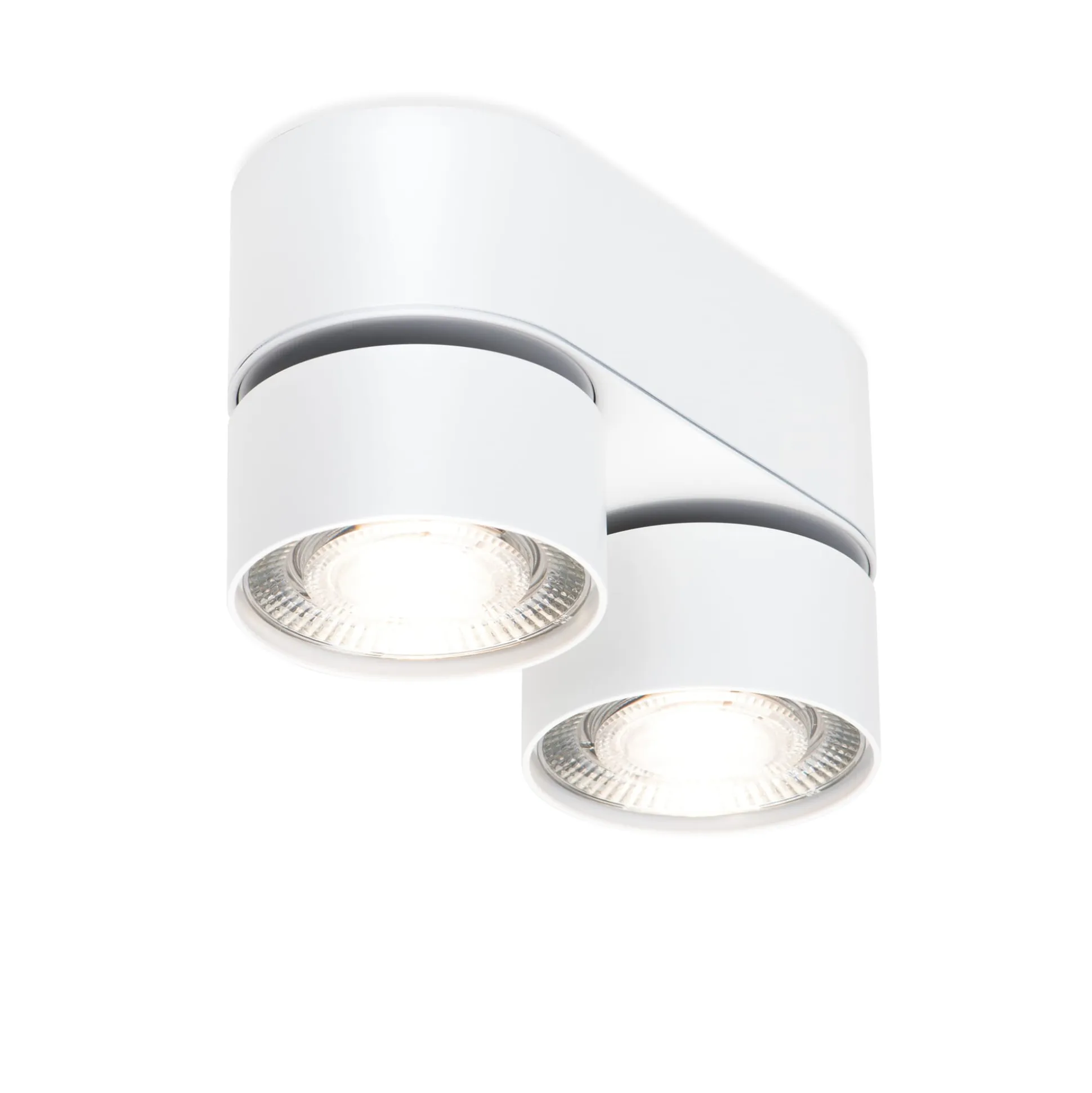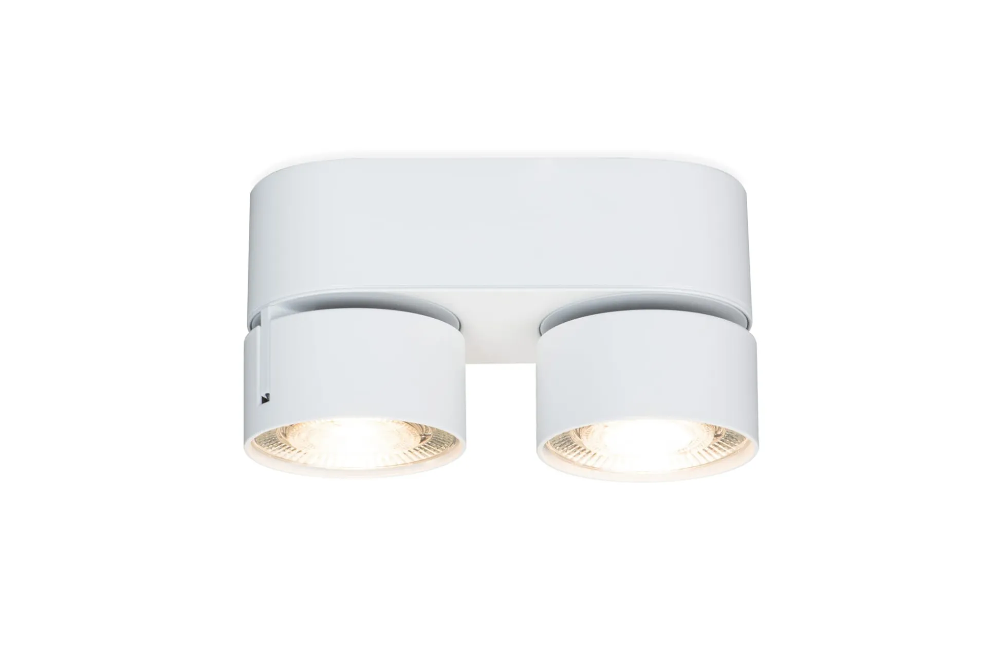 Hier in der Ausführung mit auf ein ovales Gehäuse aufgesetzten Leuchtenköpfen: vielseitig einsetzbarer Aufbaustrahler zur Akzentbeleuchtung. Die um 365 Grad drehbaren und 90 Grad zu schwenkenden Strahlerköpfe sitzen auf dem ovalen Gehäuse auf. Mit einem Griff lässt sich der gesamte Lichtkopf dank eines patentierten Bajonetts zur Wartung vom Gehäuse lösen. Aufwendiges Gehäuse, schön gefertigt, ohne sichtbare Schrauben und Kabel. Der Lichtaustrittswinkel der Leuchtmittel liegt bei 12 Grad und erzeugt damit ein punktuelles Licht. Im Lieferumfang enthalten sind zwei Aufsatzlinsen, deren Einsatz einen Lichtausfall von 38 Grad erzeugt und damit breit abstrahlt. Die Leuchte enthält LED-Lampen. Lichtstrom: 1.100 lm, Farbtemperatur: 2.700 K, Farbwiedergabe (CRI > 90), Nennleistung: 2 × 12,7 W.