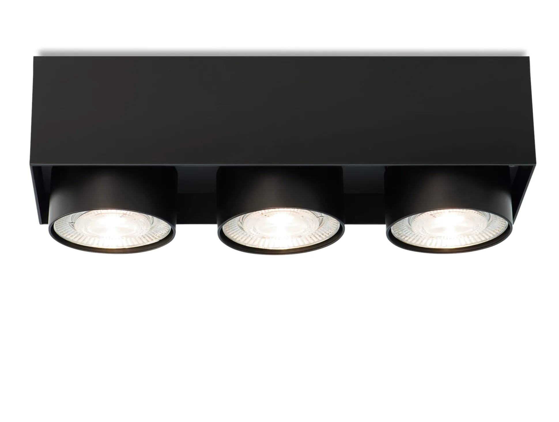 Vielseitig einsetzbarer Aufbaustrahler zur Akzentbeleuchtung. Die um 365 Grad drehbaren und 90 Grad zu schwenkenden Strahlerköpfe sitzen auf dem rechteckigen Gehäuse auf. Mit einem Griff lässt sich der gesamte Lichtkopf dank eines patentierten Bajonetts zur Wartung vom Gehäuse lösen. Aufwendiges Gehäuse, schön gefertigt, ohne sichtbare Schrauben und Kabel. Der Lichtaustrittswinkel der Leuchtmittel liegt bei 12 Grad und erzeugt damit ein punktuelles Licht. Im Lieferumfang enthalten sind drei Aufsatzlinsen, deren Einsatz einen Lichtausfall von 38 Grad erzeugt und die somit breit abstrahlen. Die Leuchte enthält LED-Lampen. 3 × Lichtstrom: 1.100 lm, Farbtemperatur: 2.700 K, Nennleistung: 12,7 W.