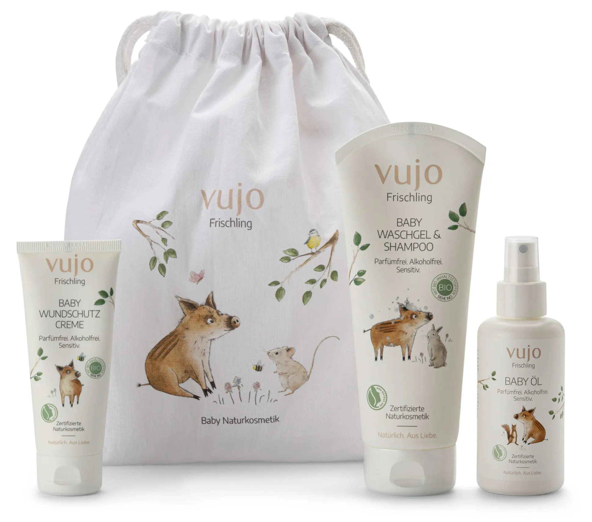 Da ist sie, die neue Seele in der Welt. Wie groß ist die Freude über das neugeborene Menschenkind, das wir natürlich behüten und umsorgen möchten. Zu unserer Fürsorge gehört auch die Erstausstattung für das Neugeborene – liebevoll für das eigene Kind oder als Geschenk zur Geburt ausgesucht. Neben Bekleidung, Bett & Co. gehört auch eine geeignete Körperpflege dazu, um die zarte Babyhaut auf sanfte Art zu pflegen. Dabei gilt: Weniger ist mehr. Deshalb werden die Körperpflege-Produkte von vujo Frischling gänzlich ohne Duftstoffe gefertigt, und selbstverständlich bestehen sie ausschließlich aus natürlichen Inhaltsstoffen, die alle den strengen Richtlinien zertifizierter Naturkosmetik entsprechen.