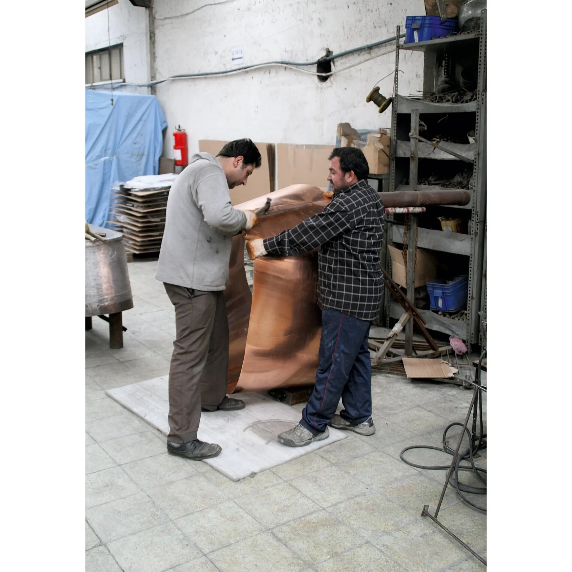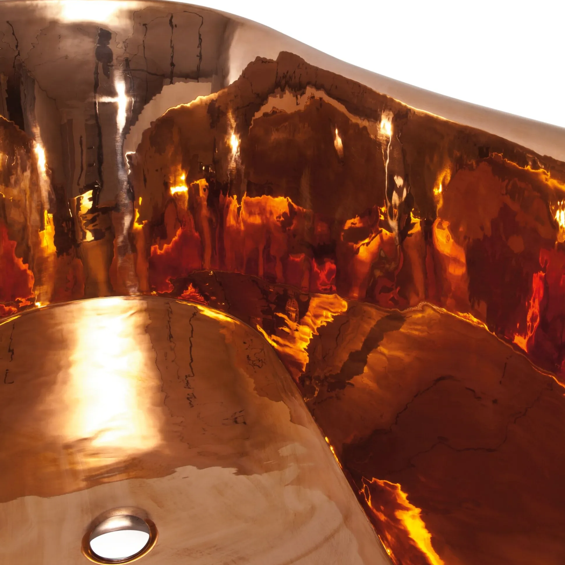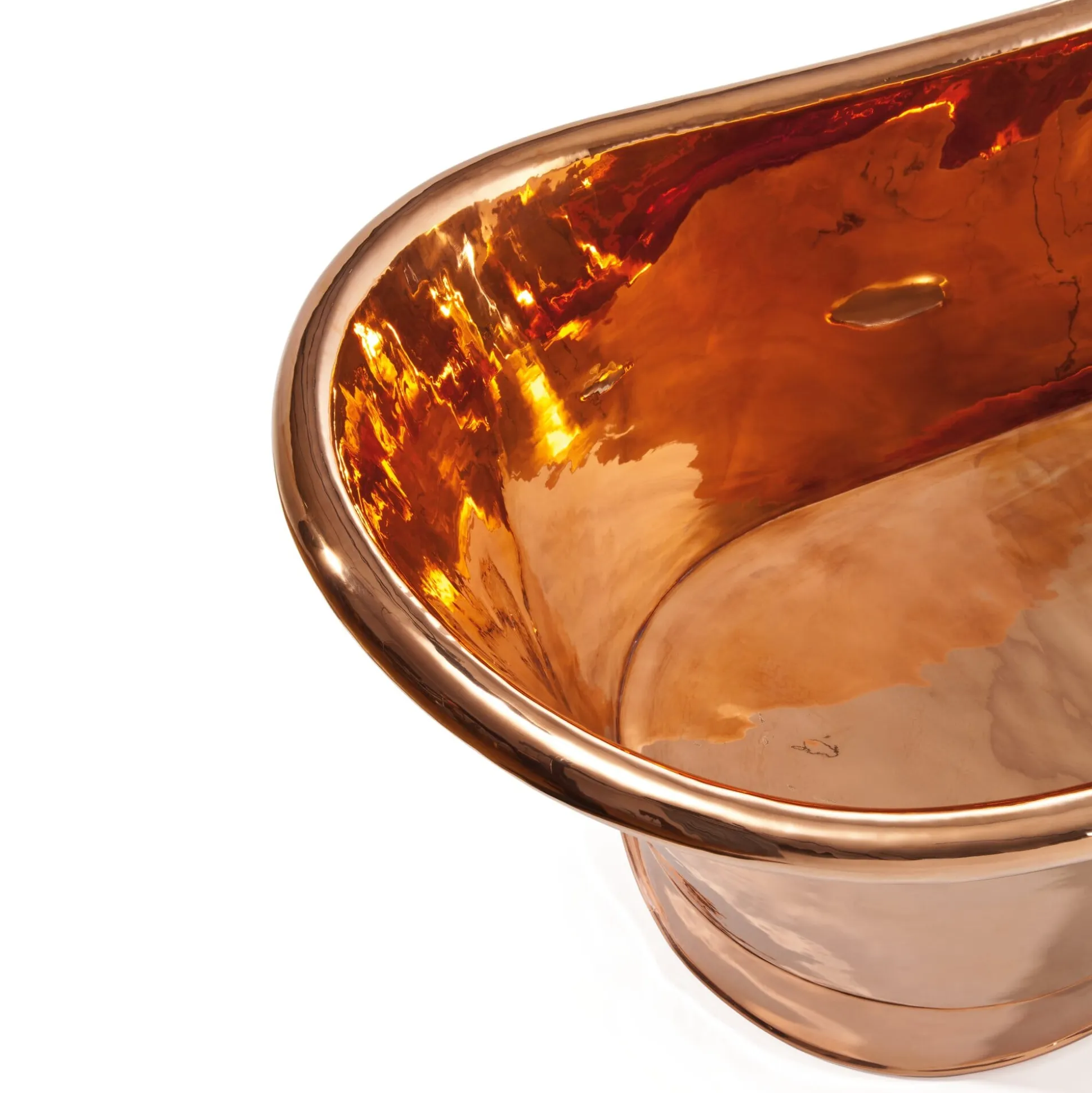 Solche Prachtstücke entstehen, wenn eine tausendjährige Badekultur auf eine ebenso alte, bis heute lebendige Handwerkskultur trifft – und zwar unter abertausenden Hammerschlägen. Diese Kupferwanne aus der Türkei ist nicht etwa maschinell über ein Tiefziehwerkzeug in Form gepresst, sondern sie findet ihre perfekte Form nach eineinhalb Wochen konzentrierter Arbeit zweier Handwerker, die es in Sachen Formgenauigkeit und Präzision fast mit einer modernen Presse aufnehmen könnten. Fast, und gerade darin liegt der Reiz, denn die in Form gebrachte Wand ist nicht absolut glatt. Die formbringenden Schläge mit Holz- und Kunststoffhämmern führen vielmehr am Ende zu einer äußerst gleichmäßigen, aber eben doch minimal gewellten Oberfläche, auf der sich das Licht vielfach bricht. Gleichzeitig wird das Kupfer auf diese Weise (ähnlich wie Eisen beim Schmieden) stabilisiert. Verarbeitet wird reines Kupferblech mit einer Wandstärke von mindestens 1,2 mm. Wenn Seitenwand, Sockel und Boden die gewünschte Form angenommen haben, werden sie mit dem Korpus verschweißt und anschließend alle Übergänge verschliffen. Ein in den unteren Rand des Sockels eingearbeitetes Edelstahlband schafft zusätzliche Stabilität.