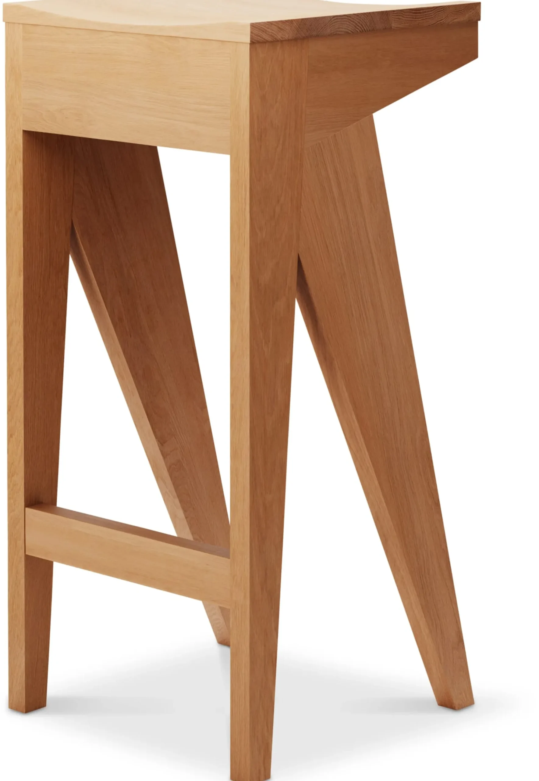 Gefertigt aus massivem Esche- oder Eichenholz in Deutschland, zeichnet sich der Barhocker durch seine präzise Verarbeitung und eine dynamische Silhouette aus. Die nach vorne gerichteten Hinterbeine verleihen ihm ein futuristisches, fast abstraktes Profil. Die deutlich sichtbare Maserung zeigt die hochwertigen Hölzer und gibt jedem Hocker eine individuelle Note.