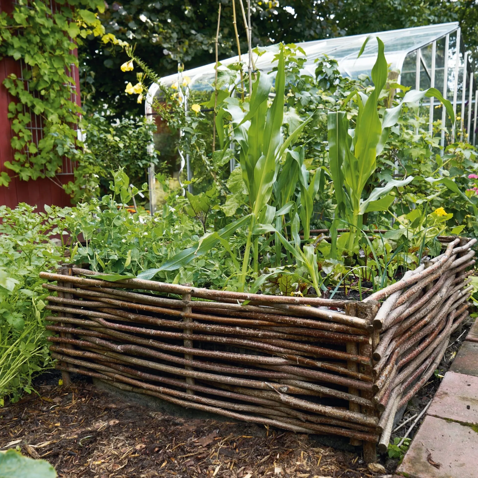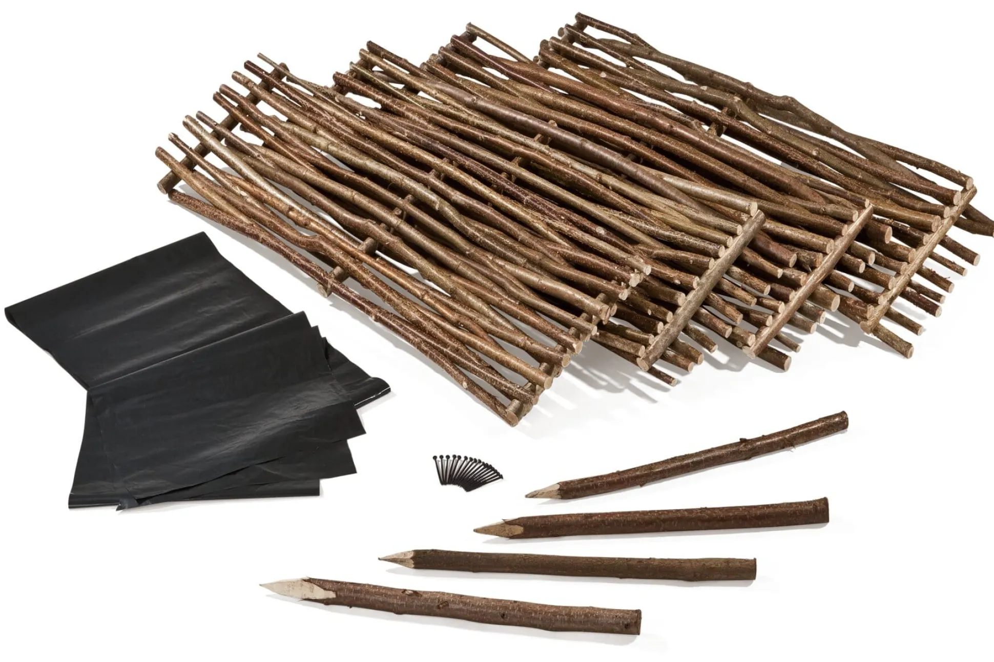 Vier Seitenelemente aus Haselruten und vier Pfosten aus Haselnussholz, PE-Folie, zum Bau einer quadratischen Beetumrandung. Lieferung mit Befestigungsmaterial, ohne Inhalt.