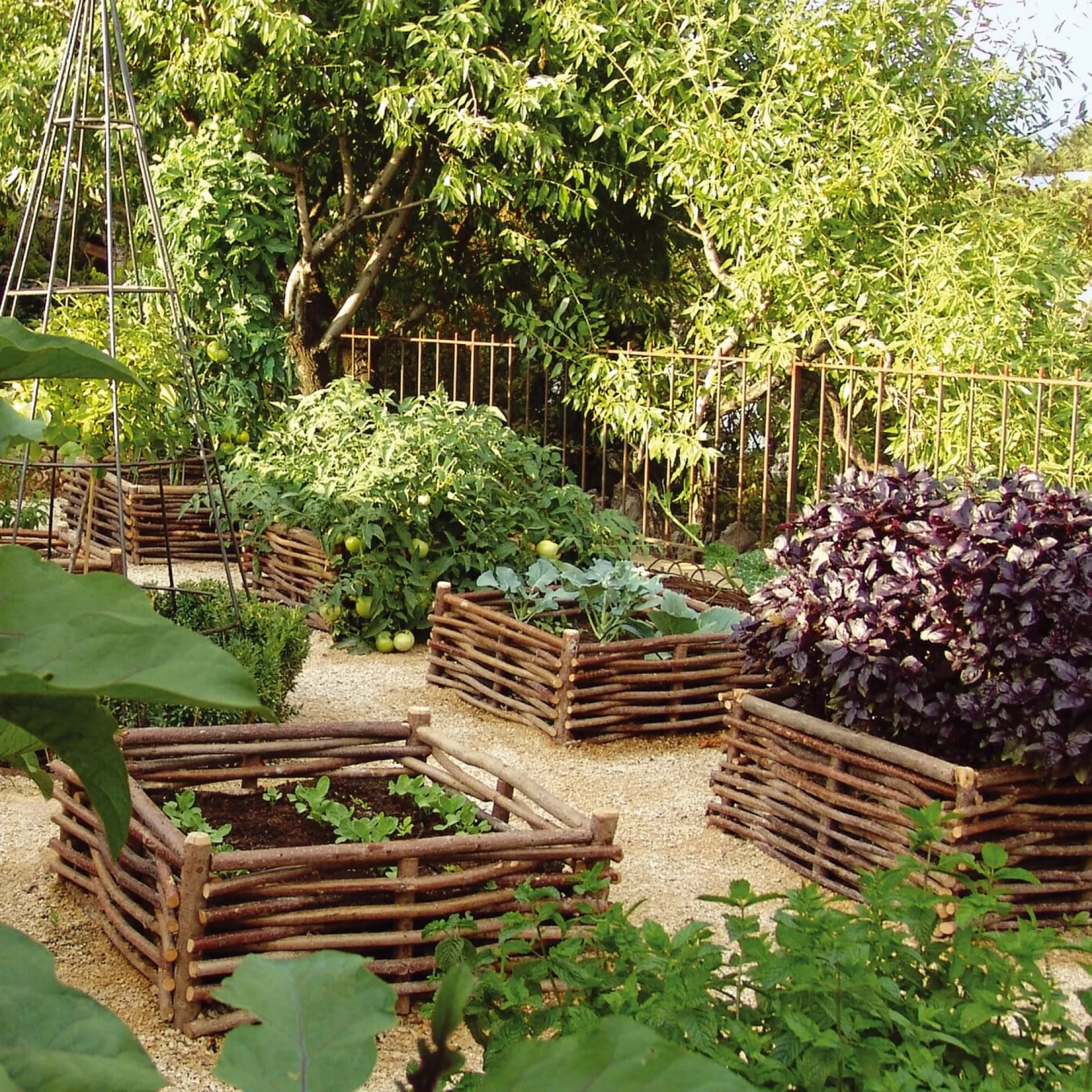 Die Tradition, Beete – meist kleinere, quadratische – mit Umzäunungen aus geflochtenen Haselruten zu versehen, ist Jahrhunderte alt. In mittelalterlichen Bauern- und Klostergärten setzte man sie beispielsweise dazu ein, Apotheken- von Küchenkräutern zu trennen, um ein Vermischen der Bestände zu verhindern. Zudem sind in den etwas erhöhten und übersichtlichen Beetflächen Unkraut, Schädlinge und Krankheiten besser in Schach zu halten. In heutiger Zeit können die Umzäunungen noch einen ganz anderen Zweck erfüllen: Mit ihrer Hilfe lassen sich in jedem städtischen Hinterhof, vollkommen unabhängig von der Güte des Bodens, kleine Kräutergärten anlegen. Dazu wird der Rahmen einfach auf den Untergrund – auch auf Beton- oder Schotterflächen beispielsweise – gestellt (zu diesem Zweck müssen die Pfosten gekürzt werden), mit der beiliegenden Folie ausgekleidet und mit guter Erde befüllt. Die Maße der Flechtelemente können leicht variieren.