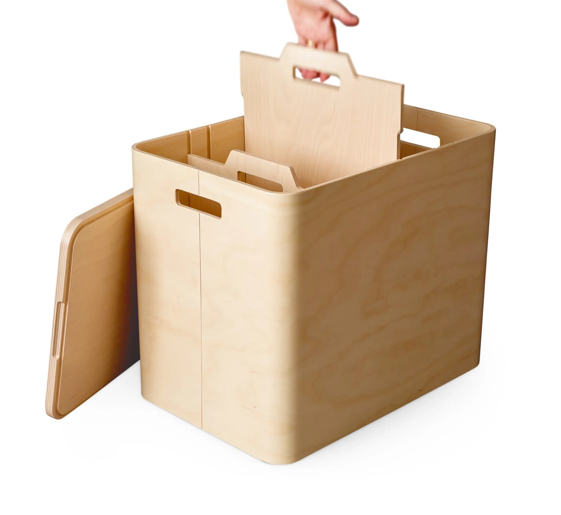Schöne Kiste, fein gearbeitet aus finnischem Schichtholz. Zwei separat einschiebbare Fachteiler sorgen für individuelle Unterteilung des Innenlebens. ECOSMOL ist Staumöbel für vielerlei Zwecke: im Büro als Archivbox für Zeitschriften etc., im Haushalt als Aufbewahrungsmöbel für Utensilien oder als Abfallsammler und -sortierer. Durch die stabile Konstruktion ist ECOSMOL auch als Hocker beispielsweise im Flur nutzbar oder als Beistelltisch neben Bett und Sofa.