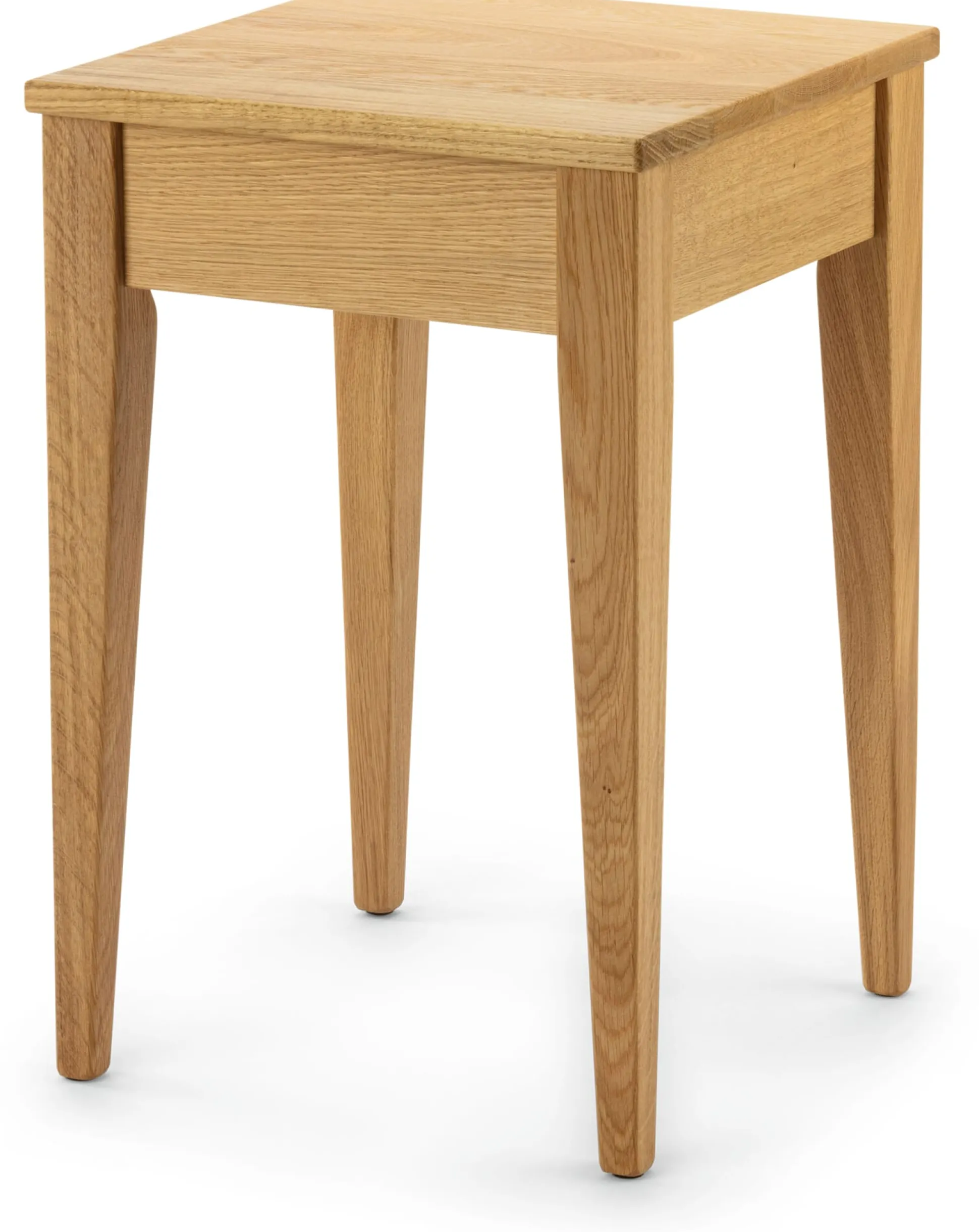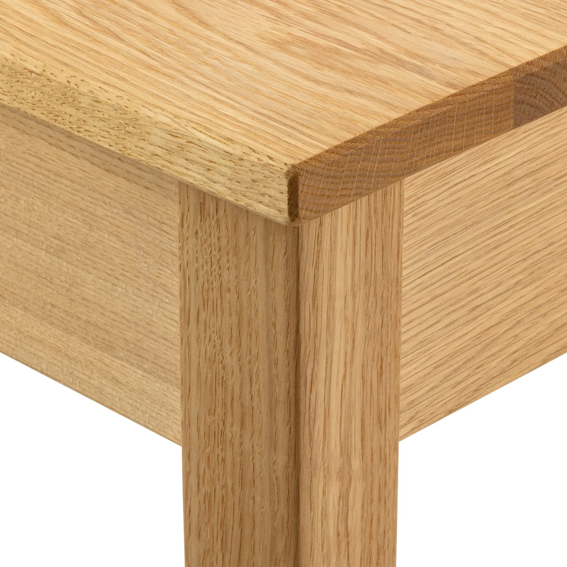 In jedes Interieur, ob minimalistisch nüchtern oder opulent verspielt, fügt sich dieser Beistelltisch mit seinem zeitlosen, reduziert-klaren Design ein – und überzeugt mit dauerhafter Wertigkeit. Das hohe Niveau der handwerklichen Konstruktion aus heimischem Eichenholz belegt die Tischplatte, die aus durchgehenden Lamellen gefertigt ist. Bis in die Stahlbeschläge der Tischzargen und -beine hinein spricht die Qualität der Handwerksarbeit für sich selbst. Die schlanken, leicht angeschnittenen Beine zitieren die Formensprache des Mid-Century modern und verleihen dem Beistelltisch bei aller konstruktiven Solidität die tänzerische Eleganz eines Relevé. In Griffweite der Couch macht der Beistelltisch damit eine ebenso beständig gute Figur wie als Ablage in Flur, Schlafzimmer & Co.