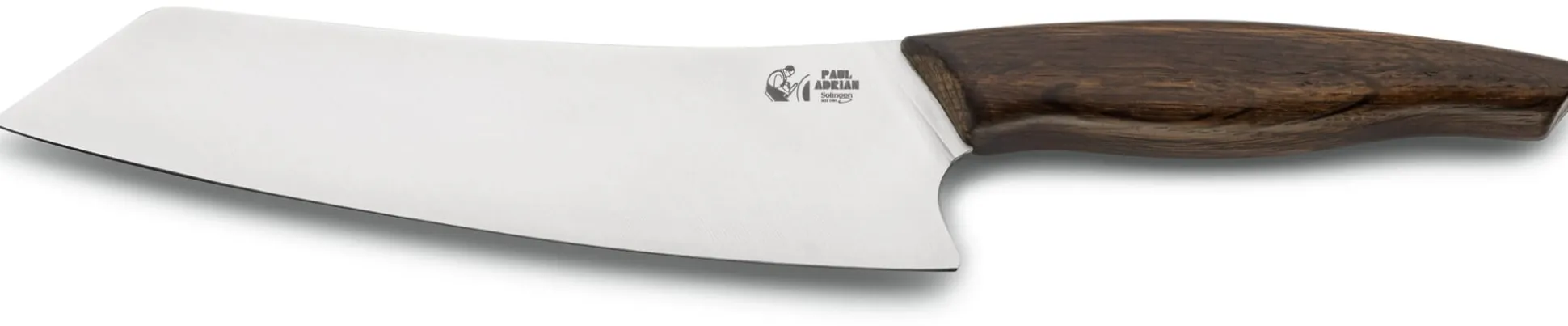 Das richtige Kochmesser zu entdecken, ist ein bleibendes Erlebnis, kann es doch viel mehr sein als ein einfaches Küchenwerkzeug: Einmal in die Hand genommen, schmiegt es sich an Finger und Handfläche und wird ganz selbstverständlich zur Verlängerung des eigenen Armes, jede Bewegung geht fließend von der Hand, jeder Schnitt sitzt. Um das passende Kochmesser zu finden, bei dem Sie auf einen Griff sagen, dass es Ihnen angenehm und ausgewogen in der Hand liegt, lassen sich ein paar wesentliche Kriterien einbeziehen. Dazu gehört an erster Stelle die Größe Ihrer Hand, aber auch die Größe des Schneidbretts, das Sie am liebsten benutzen, und die Frage, ob bei Ihnen oft die große oder eher die kleine Runde bekocht wird. Das Feinschneiden von Zwiebeln, Knoblauch, Kräutern und Co., eine der häufigsten Aufgaben des Kochmessers im Küchenalltag, lässt sich mit einer kürzeren, weil wendigeren Klinge zügiger ausführen, da die Schneidewege kürzer sind und sich präzise Schnittbewegungen schneller dirigieren lassen. Eine kürzere Klinge gilt daher bei einem Kochmesser als besonders einsteigerfreundlich, zugleich schätzen Profis, die Wert auf präzise Schnittführung legen, die hohe Kontrolle über die Klinge. Wenn größere Mengen in einer einzigen Schneidebewegung oder voluminöses Schnittgut zu verarbeiten sind, greifen Küchenchefs dann zur längeren Klinge. Die Kochmesser aus der „Beluga“-Serie der Solinger Messerwerkstatt Paul Adrian zeichnen sich durch eine hochscharfe, leicht gebogene Schneide aus. Die Klinge, typisch für ein europäisches Kochmesser, eignet sich für den ziehenden wie für den wiegenden Schnitt. Zügig und gleichmäßig können Sie Ihr Schnittgut damit verarbeiten – von Gemüse über Kräuter bis hin zu Fisch und Fleisch –, während Ihnen das Messer dank einer gerundeten Aussparung am Übergang zum Griff (als Fingerschutz) sicher in der Hand liegt.