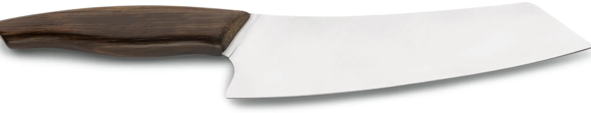 Ein gutes Messer überzeugt nicht nur mit der Schärfe und Schnitthaltigkeit seiner Schneide. Neben der Klingenform ist auch die Gestaltung des Griffes entscheidend – und nicht zuletzt das Material, aus dem der Griff gefertigt ist –, denn ein Messer, das täglich Freude bereiten soll, muss gut in der Hand liegen. Für die Griffe der Messerserie „Beluga“ verwendet der Solinger Messerhersteller Adrian Holz von heimischen Eichen, das in einem speziellen Räucherverfahren veredelt wird. Dabei entsteht ein tiefbrauner Farbton, und die Behandlung lässt das Holz langlebig, belastbar und feuchtigkeitsunempfindlich werden. Die feine Maserung bleibt hingegen bestehen. Sie verleiht zusätzlichen Grip und macht jedes Messer zum Unikat. Die angenehme Haptik der Räuchereiche korrespondiert mit der geschwungenen Form des Griffs. Die Messermacher haben sich bei der Formgebung von Belugawalen inspirieren lassen, die sich dank ihres stromlinienförmigen Körpers mit spielerischer Leichtigkeit durch die kühlen Fluten des arktischen Meeres bewegen. Die Griffgeometrie, die gleichsam den Schwung ihrer Körperform einfängt, legt die Basis für eine ermüdungsarme Schnittführung. Auch ein großes Messer, wie etwa das stattliche Brotmesser aus der Beluga-Serie, haben Sie so sicher und entspannt im Griff und können damit kraftvoll arbeiten.