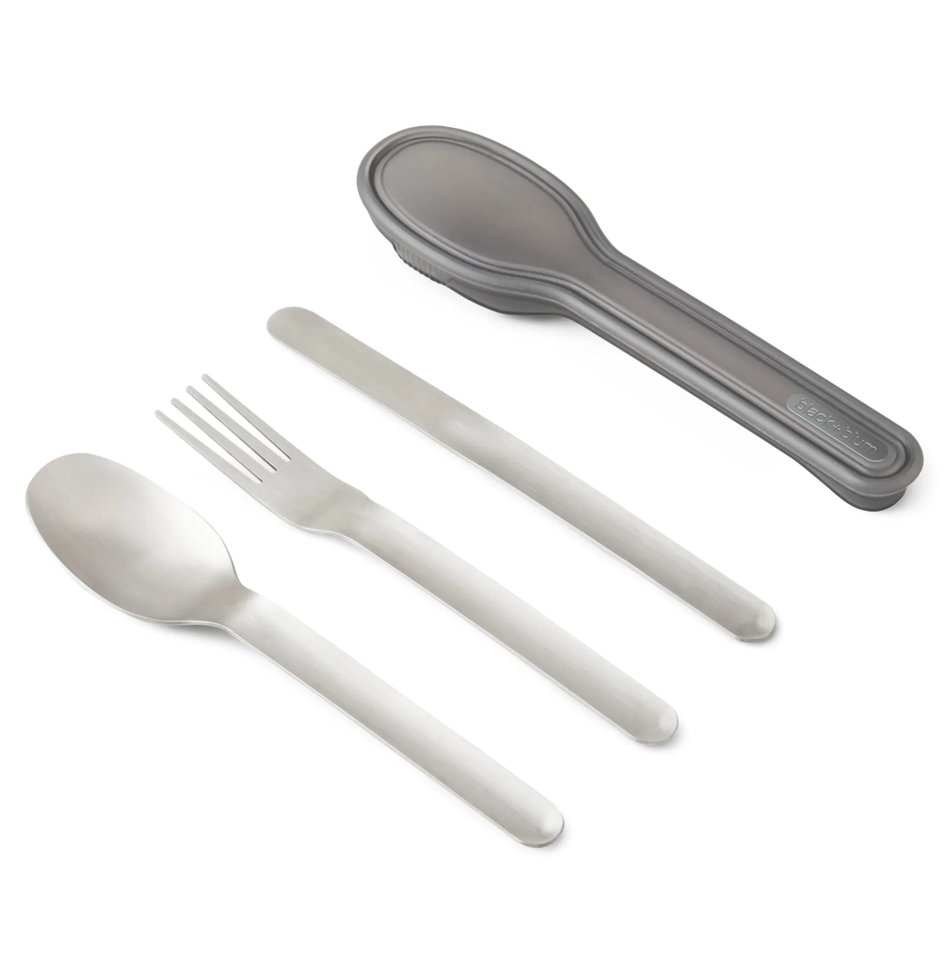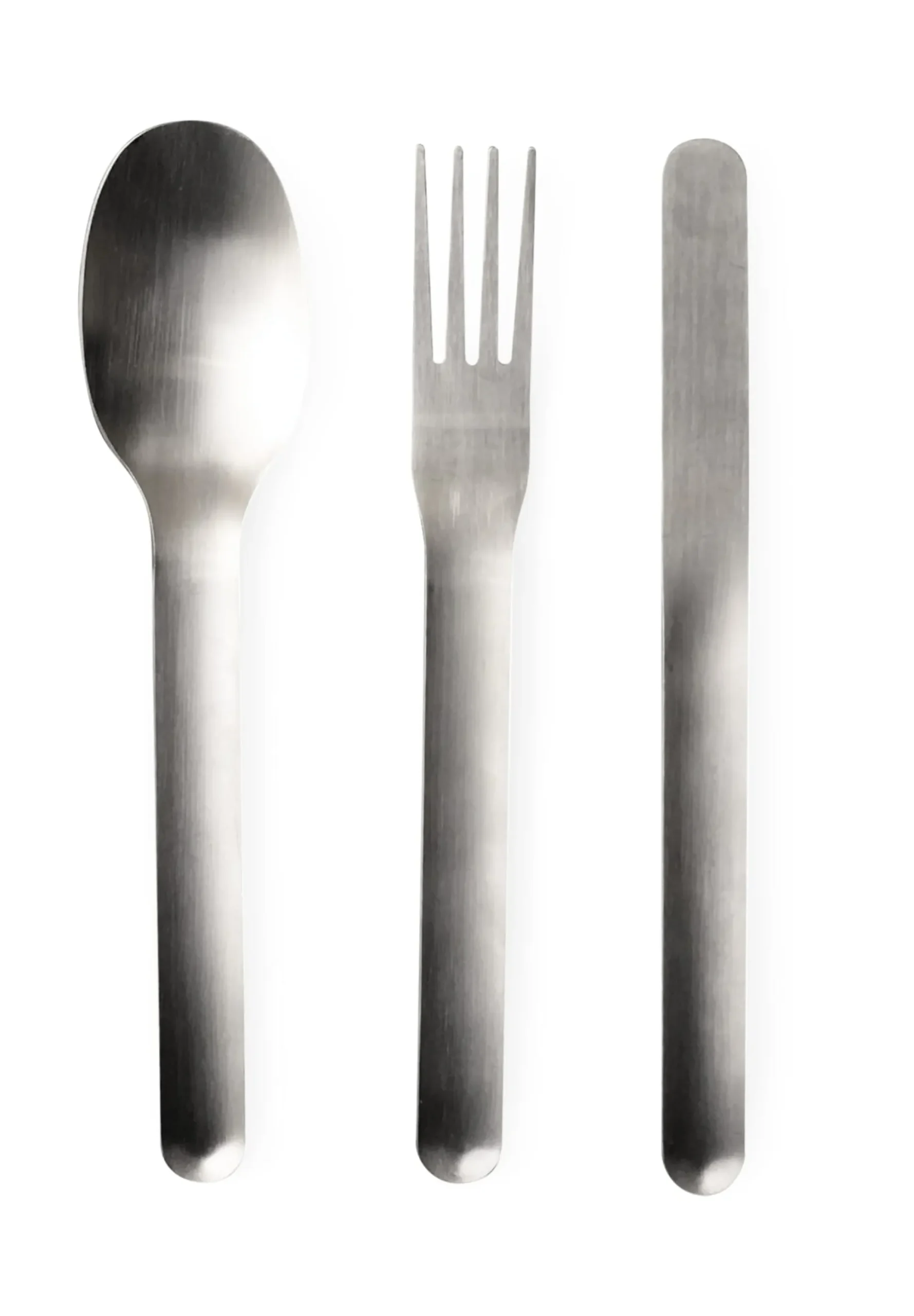 Leichtes formschönes Edelstahl-Besteck für unterwegs; Gabel, Messer und Löffel schmiegen sich in ihren Griffmulden flach ineinander. Gut verstaut in einer zweiteiligen, lichtgrau-transluzenten Box aus Polypropylen. Für die Spülmaschine geeignet.