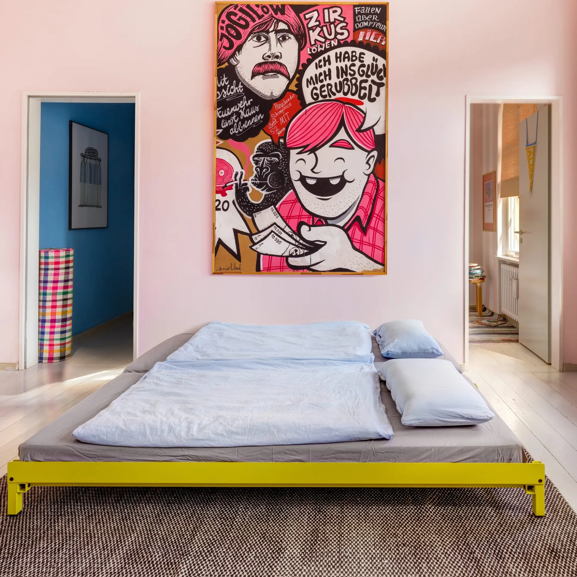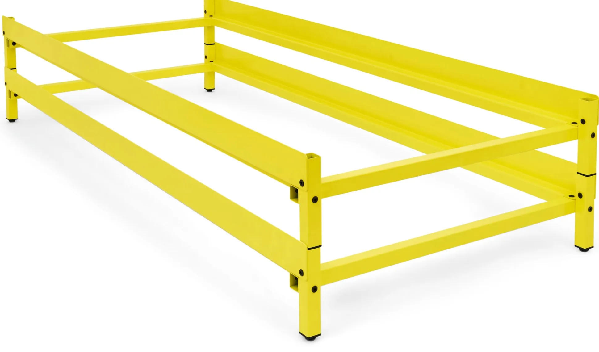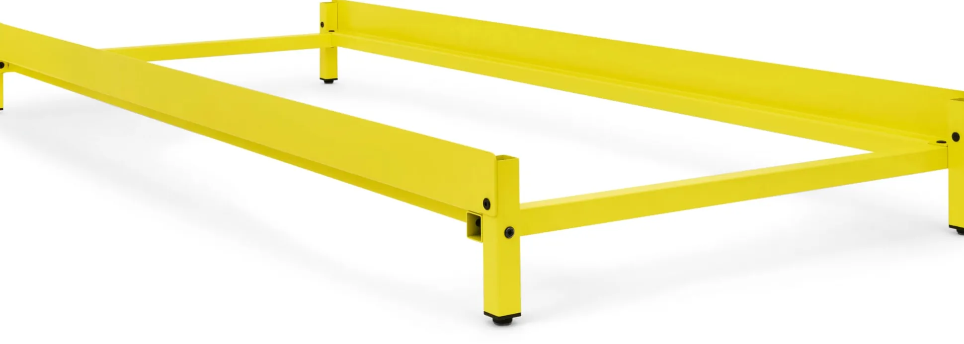 Bett ERIK ist ein im besten Sinne einfaches und äußerst stabiles Bettgestell aus sechs Vierkant-Stahlrohren und zwei gekanteten Stahlblechen, die an den Eckpunkten über Kreuz verschraubt werden. Die seitlichen Stahlbleche verhindern ein Verrutschen der Matratze. Bett ERIK ist auch stapelbar: So verwandelt es sich bei doppelter Nutzung im Handumdrehen vom gestapelten Einzelbett oder Liege spielerisch leicht zum Doppelbett. Das pragmatische Bettgestell ist für das klassische Matratzen- und Lattenrostformat 90 x 200 cm ausgelegt. Die Höhe von Lattenrost und Matratze zusammen sollte hierbei 17 cm nicht übersteigen, um die Stapelbarkeit zu gewährleisten. Leicht auf- und dank der Verschraubung auch rasch wieder abzubauen, eignet sich Bett ERIK auch für den temporären Einsatz oder den gelegentlichen Ortswechsel.