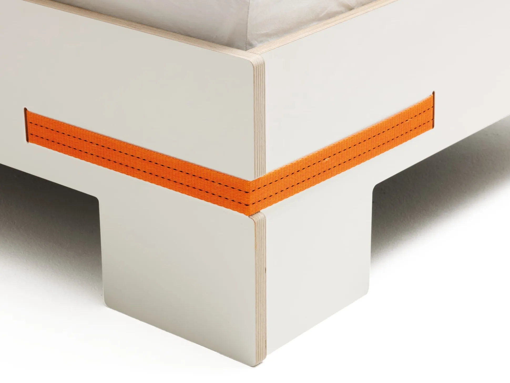 Eine Bettkonstruktion, die uns begeistert! Sie wird in doppelter Hinsicht geprägt von einem starken technischen Element, dem für die Frachtsicherung genutzten Ratschengurt. Einerseits sorgen die hinter den Ecken verborgenen Spannschlösser für exzellente Statik, andererseits kommentiert die textile Oberfläche des Gurtbandes bestens den Charakter des Möbels. Der Aufbau der sehr stabilen Konstruktion erfolgt werkzeugfrei und innerhalb weniger Minuten.