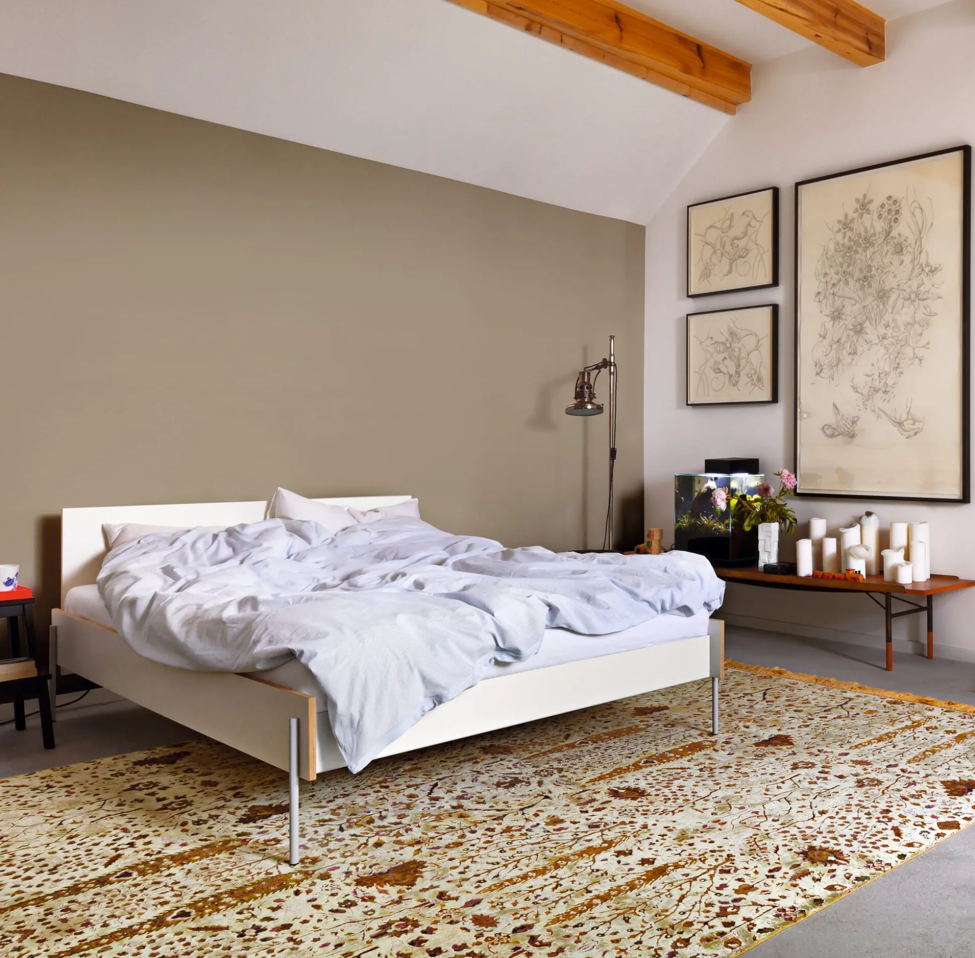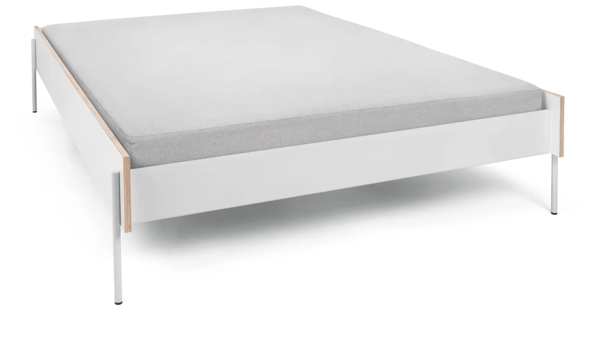 Eine formschöne und filigrane Konstruktion: Bett HANS steht auf feinen Stahlfüßen, die sich aus den stählernen Kopf- und Fußteilen entwickeln. Diese werden mit den beiden Bettseiten aus weiß beschichtetem Birkensperrholz verbunden und zu einer tragenden Einheit gebracht. Kopf- und Fußteil sowie die beiden Seiten werden durch eine Schlitzverbindung beschlagfrei zusammengesteckt. Das Zusammenspiel der beiden Materialien Stahl und Holz lässt das Bett sehr feingliedrig erscheinen, was durch die an den Kanten sichtbare Holzschichtung der Seitenteile unterstützt wird. Gleichzeitig überzeugt das Bett durch seine Stabilität und Tragfähigkeit. Der formal eigenständige Entwurf zeigt in Materialwahl und Bauweise Anklänge an typische Gestaltungsmerkmale der Ulmer Schule.