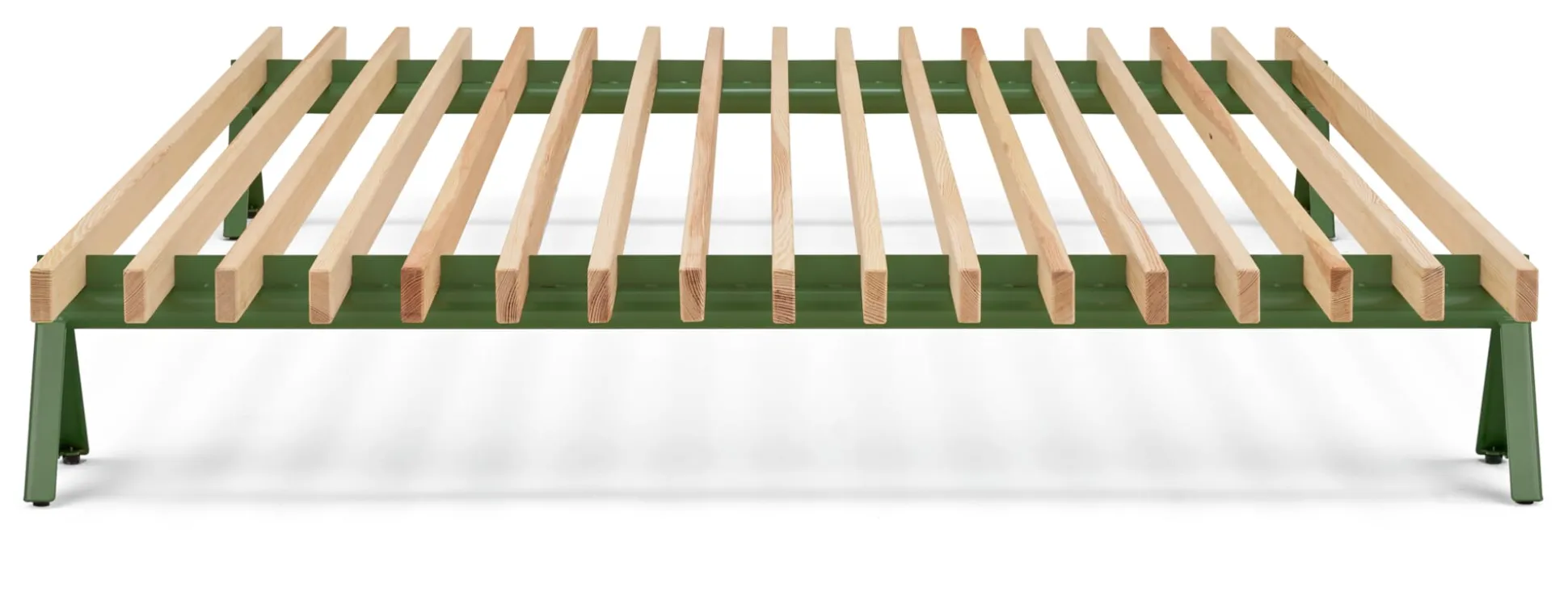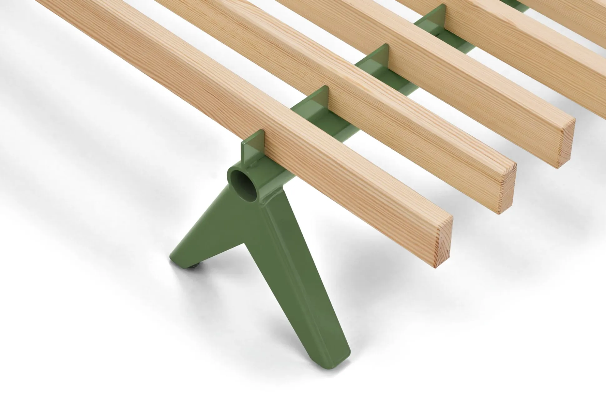 - Latten aus massivem Kiefernholz auf zwei stabilen, gezahnten Stahlträgern