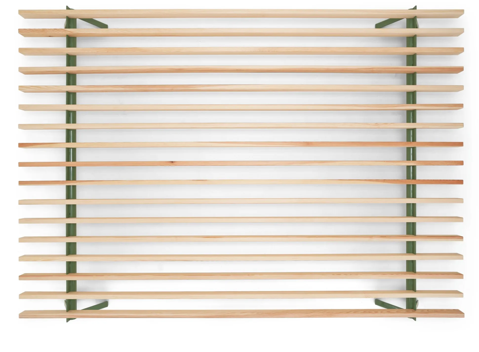 Ein schöner Effekt: Werden beim Doppelbett kleinere Matratzenbreiten verwendet, so ist die Lattenstruktur teilweise sichtbar und bedingt als Ablagefläche nutzbar. Die Länge der Latten beträgt 195 Zentimeter – Matratzen in Längen von 200 Zentimetern stehen bewusst leicht über die Enden der Holzteile hinaus.