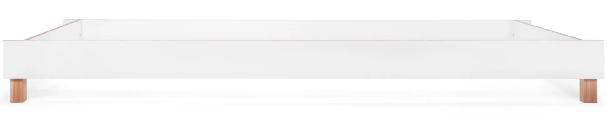 Material: Bettrahmen: Birke Multiplex (Herkunft: Osteuropa), 18 mm, beidseitig weiß melaminharzbeschichtet (bei den aus dem Karosseriebau stammenden Multiplexplatten sind Farb- und Strukturunterschiede sowie vereinzelt kleine Druckstellen möglich), Lattenrostauflage: Fichte/Tanne (Herkunft: Deutschland), Beine: Esche, unbehandelt (Herkunft: Deutschland), Traverse: Edelstahl