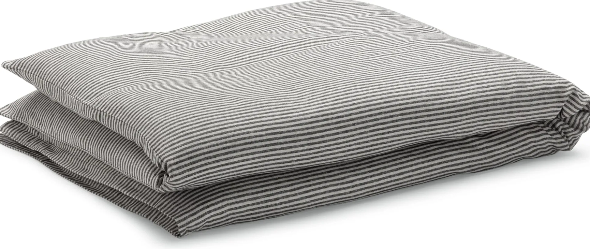 Für diesen Baumwollflanell wird feines, weiches Garn mit der Stärke Nm 27 verwendet, dadurch entsteht ein sehr dichtes und gleichmäßiges Gewebe mit weichem Griff. Mit einem Materialgewicht von 167 g/qm ist der Bauwollflanell zudem angenehm leicht. Die feinen schwarzen Streifen dieses Bettbezugs aus schmiegsamem Baumwollflanell sind übrigens eingewebt (nicht gedruckt), der Fond ist naturfarben. Geschlossen wird der Bezug mit Holzknöpfen.