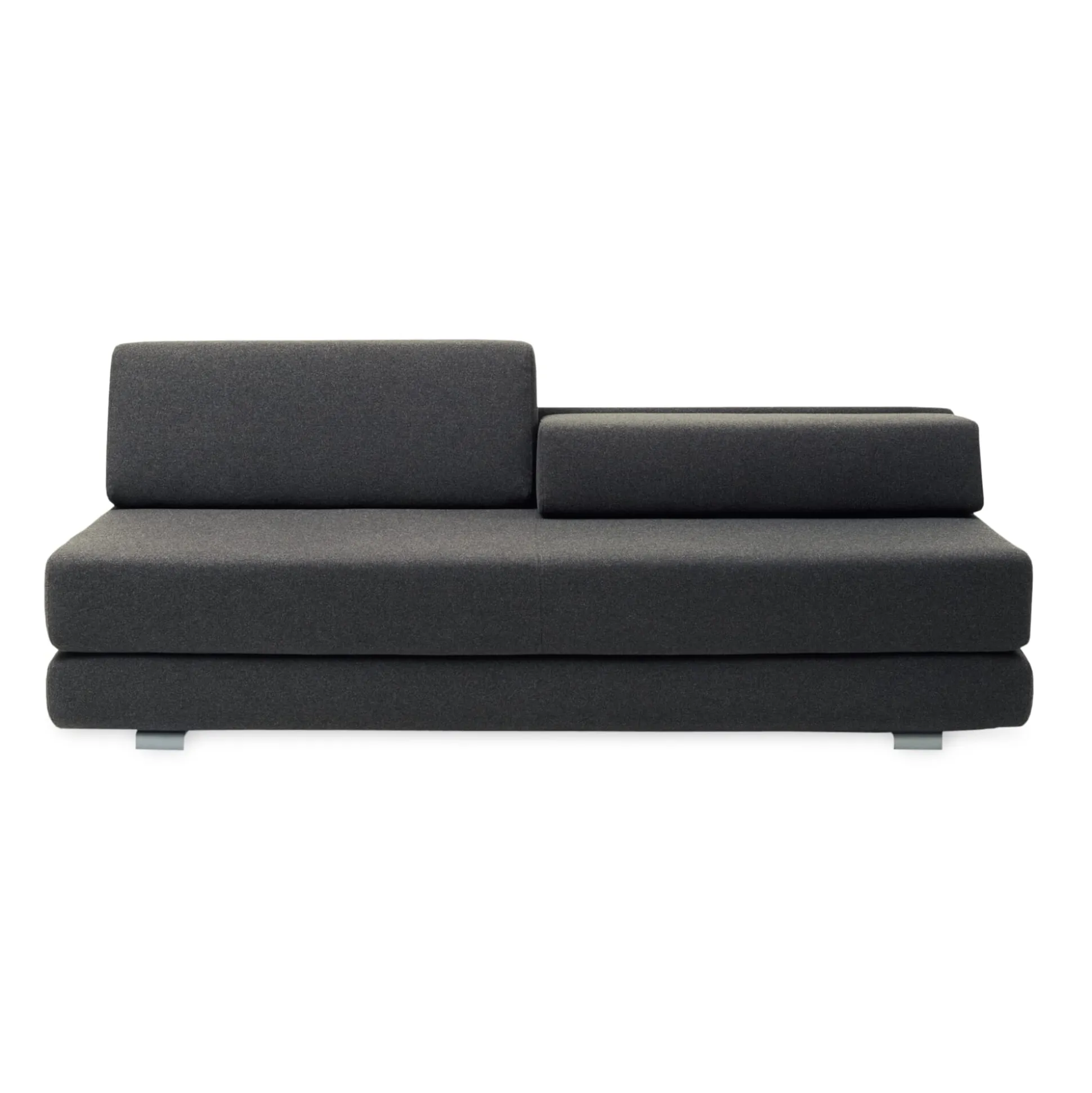 Formal reduziertes, geradliniges Sofa. Die Polsterelemente, Matratze und die beiden Rückenlehnpolster sind lose auf die Basis aufgestapelt. Somit kann LOUNGE vom dreisitzigen Sofa im Handumdrehen in ein Einzel- oder sogar ein Doppelbett verwandelt werden. Außerdem können die Sitztiefe und die komplette Höhe der Rückenlehnen durch Umgruppieren der Rückenpolster individuell verändert werden. Ein sympathischer Vorteil: Das ganze funktioniert ganz ohne aufwendige, verschleißanfällige oder kostenintensive Klappmechanik.