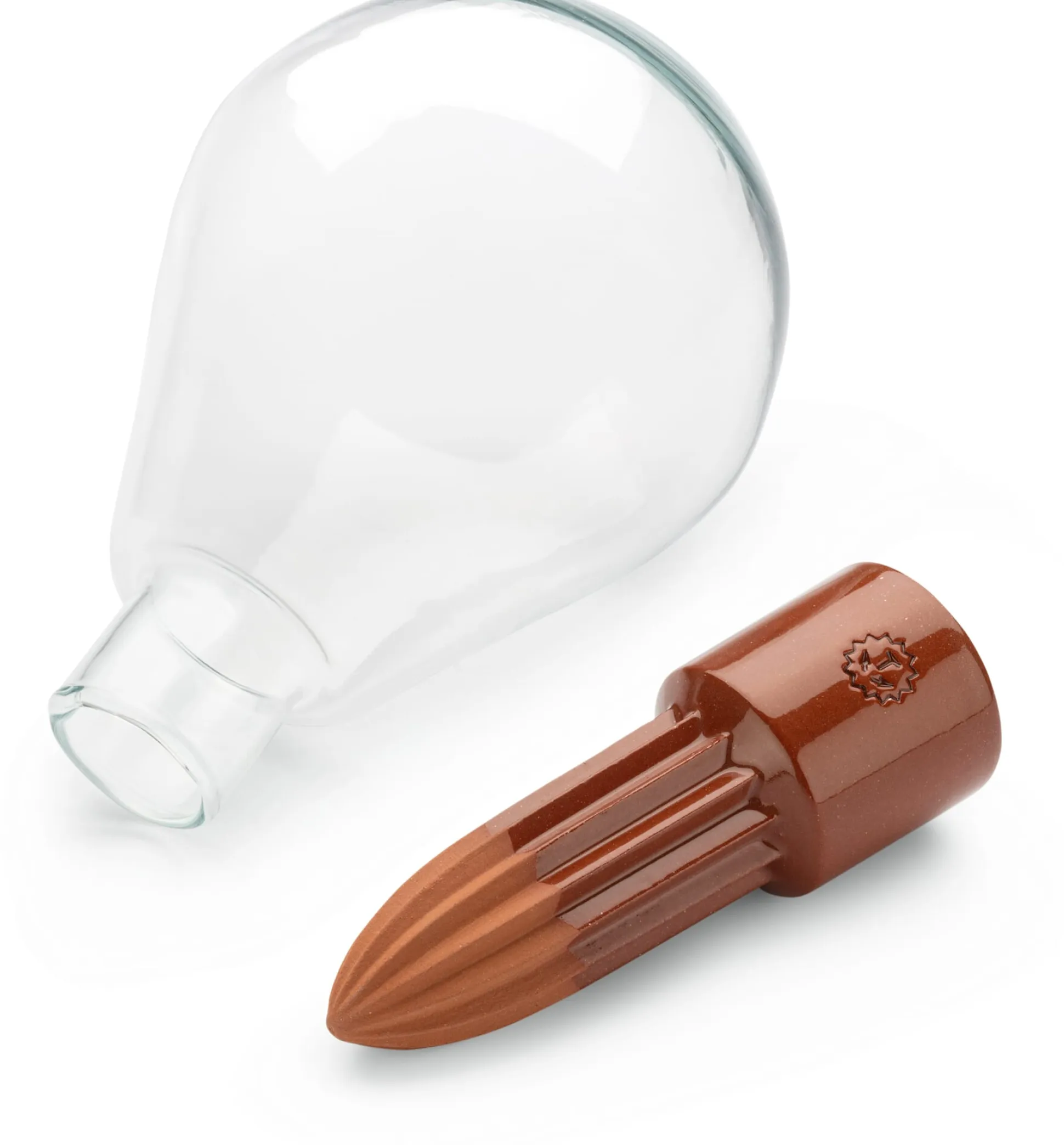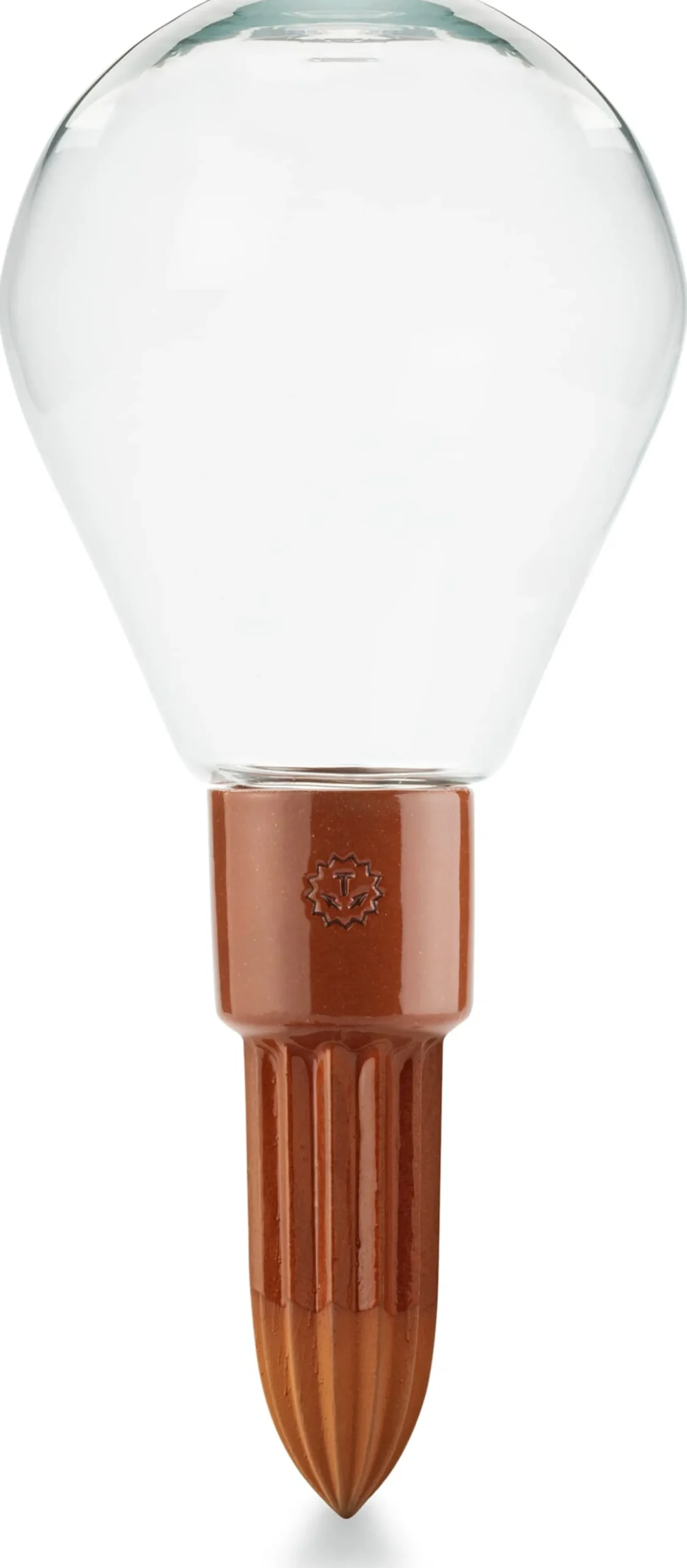 Terrakotta teilweise glasiert (Kegel Ø unten 2,5 cm), Glaskugel (Volumen ca 600 ml, Ø 10 cm). Gesamtlänge 23 cm. Gewicht 170 g. Hergestellt in den Niederlanden.