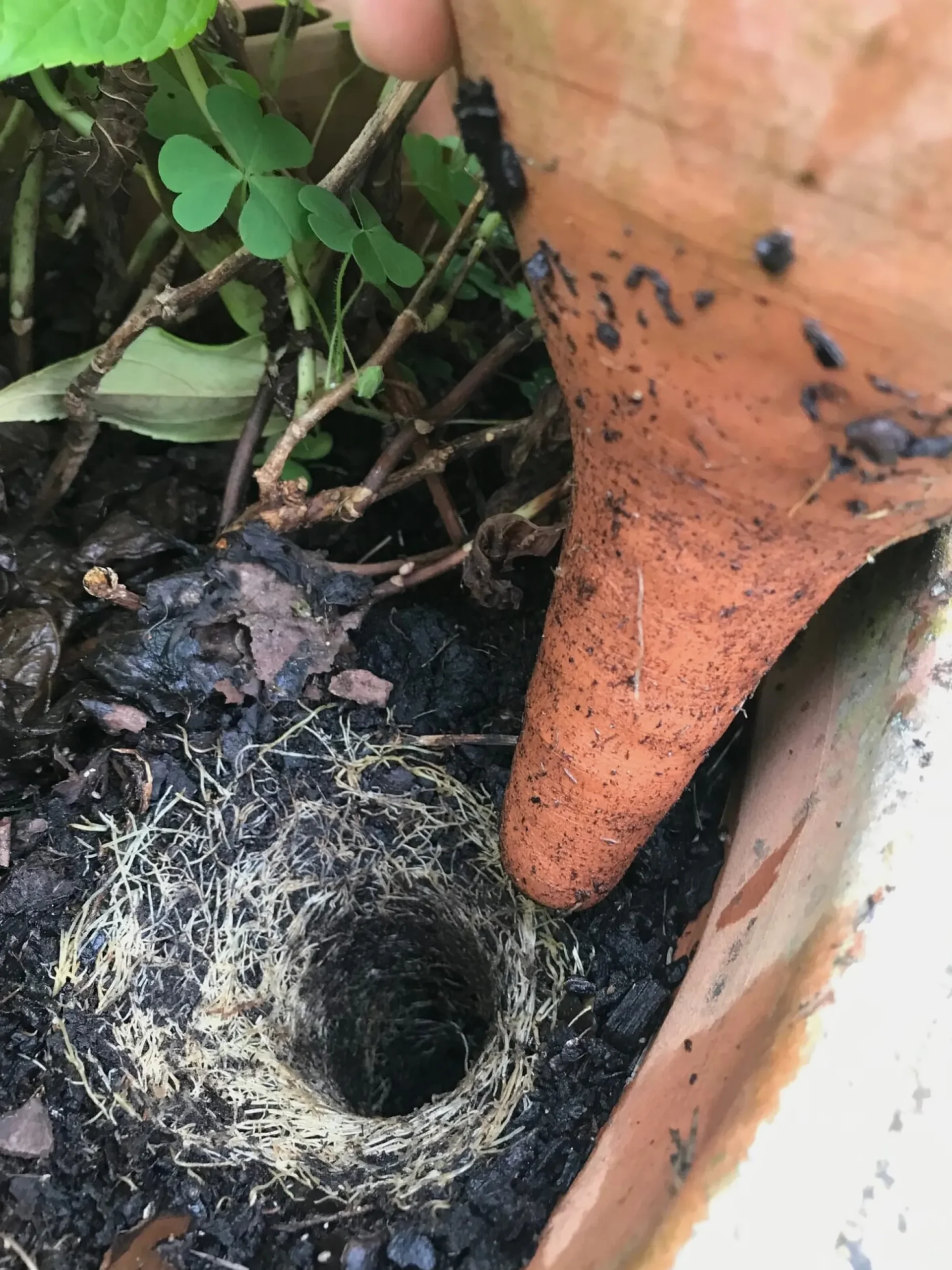 Wessen ästhetisches Bewusstsein schon einmal darüber gestolpert ist, dass eine PET-Flasche als Wasserreservoir aus dem Pflanzkübel herausragt, dem sei dieser Bewässerungstopf an Herz und Pflanze gelegt. Handgetöpfert in Deutschland aus niedrig gebranntem und daher luft- und wasserdurchlässigem Ton, übernimmt er die Versorgung Ihrer Balkon- und Zimmerpflanzen. Das Prinzip ist bekannt und ebenso simpel wie ressourcenschonend: Füllen Sie den Tontopf randvoll mit Wasser und schieben Sie ihn mit dem kegelförmigen Ende voran ins (bewurzelte) Erdreich, so nimmt die Spitze stetig Feuchtigkeit auf, speichert sie und gibt sie bei zunehmender Trockenheit gleichmäßig wieder an ihre Umgebung ab. Auf diese Weise können Sie auch bei älteren, gut eingewachsenen Kübelpflanzen eine kontinuierliche Wasserversorgung sicherstellen und müssen überdies seltener gießen. Achten Sie nur darauf, regelmäßig Wasser nachzufüllen. Unser Tipp: Bedecken Sie die Erde im Kübel zusätzlich mit einer Mulchschicht, hält sich die Feuchtigkeit sogar noch etwas länger.