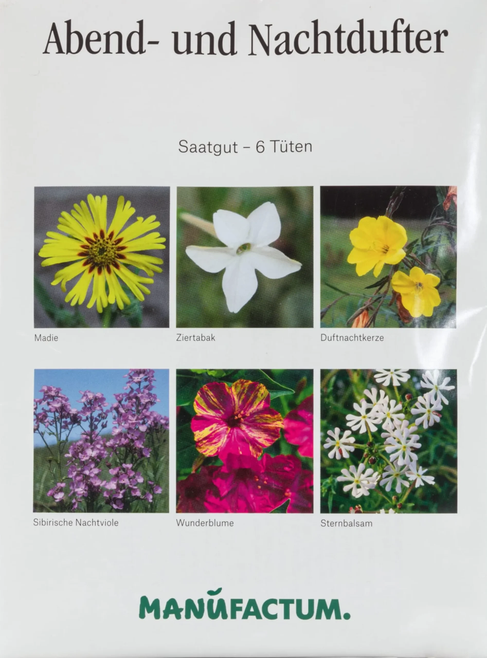 Zum Erhalt alter oder ungewöhnlicher Sorten beizutragen ist und bleibt eines unserer zentralen Anliegen. Was man erhalten will, muss man aussäen – das gilt natürlich auch für Blumen. Daher bekommen Sie bei uns abseits des üblichen Standartsortiments auch Sämereien seltener, beinah vergessener Blumen. Das besondere Merkmal aller in diesem Set zusammengefassten Sorten: In den ruhigen Abendstunden vermögen sie den ganzen Garten mit ihrem Duft zu erfüllen.