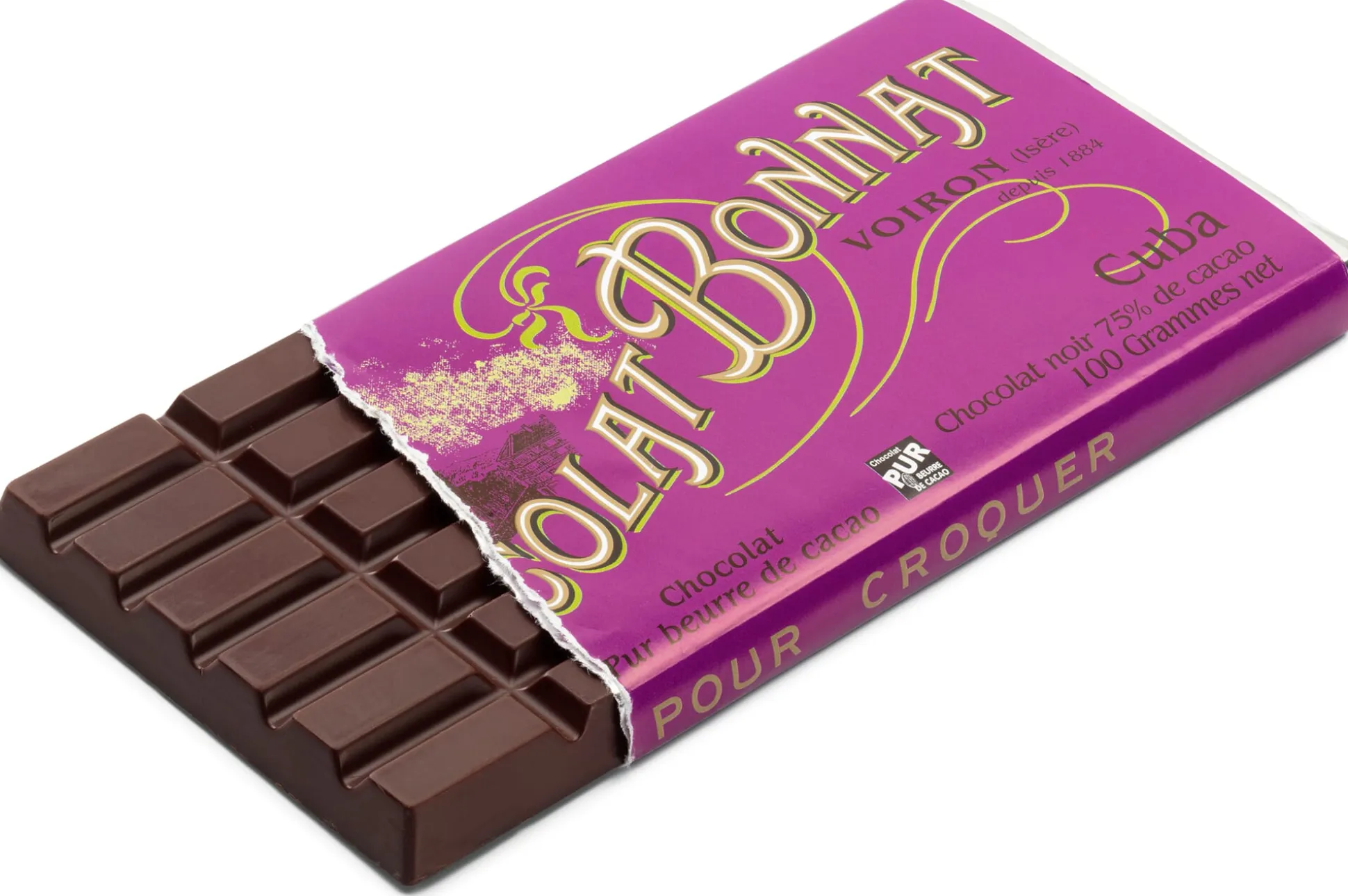 Der Trinitario-Edelkakao für diese Schokolade stammt aus Kuba. Die ausgesuchten Bohnen geben anfänglich eine dezente Säure, die von Noten gerösteter Nüsse und Kokosnüsse abgelöst wird. Am Ende des Genusses steht ein langer und kräftiger schokoladiger Abgang. Die Cuba-Schokolade ist eine Bonnat-Schokolade aus der Serie „Les Grand Crus d’Exception“, bei der die Anbauregionen noch enger gefasst sind als bei den klassischen Grand-Cru-Schokoladen. von Bonnat.