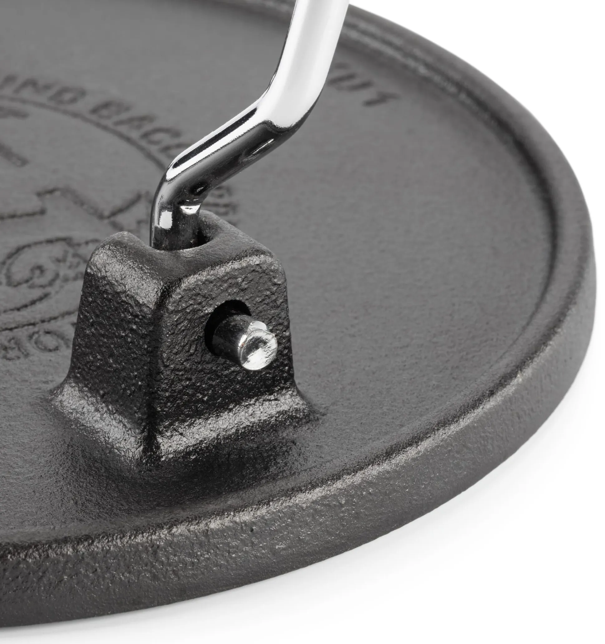 Das perfekte Werkzeug, um den vollflächigen Kontakt herzustellen, ist unsere Brat- und Grillgut-Presse. Aus Gusseisen gefertigt, bringt sie das richtige Gewicht mit. Der klappbare, spiralförmige Griff ist aus weniger wärmeleitfähigem Edelstahl gemacht und lässt sich daher auch ohne Topflappen gut greifen.