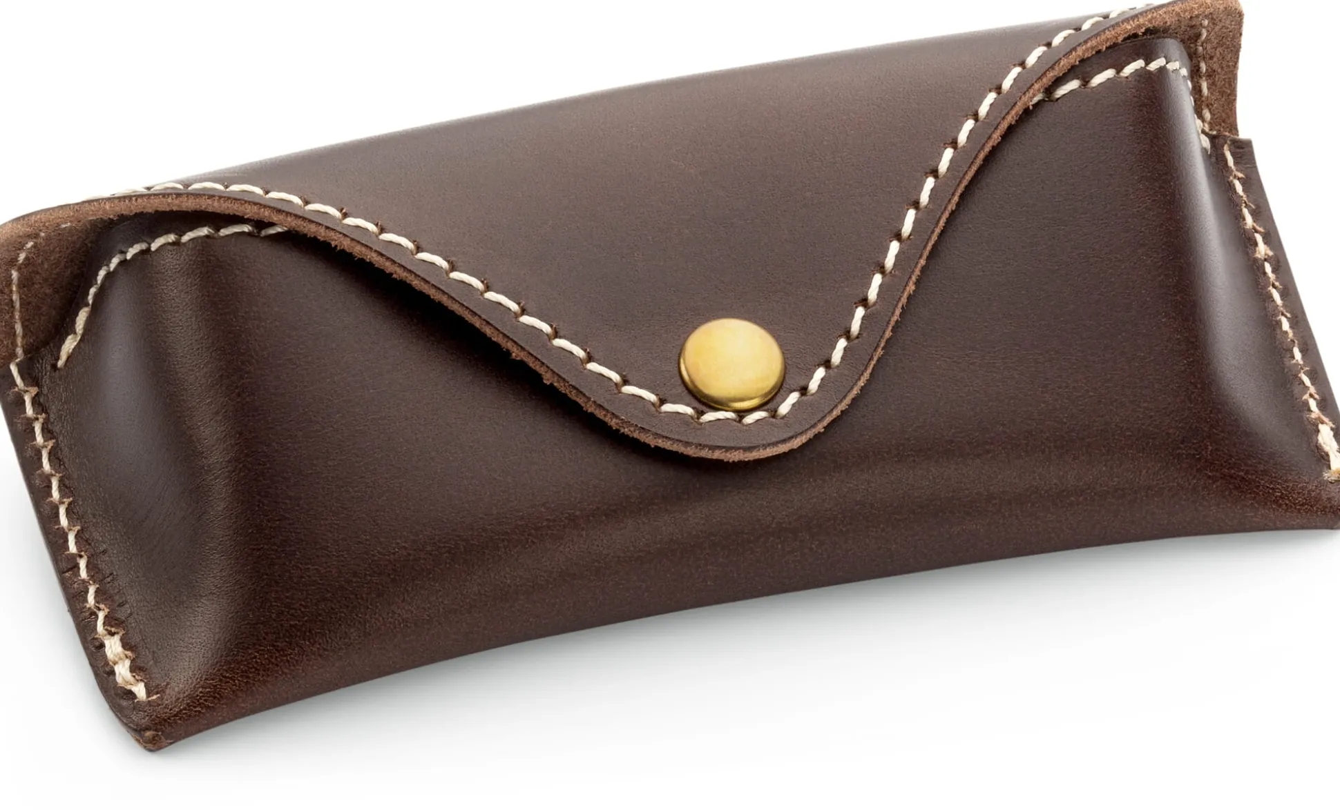 Aus kräftigem und doch geschmeidigem Rindleder gefertigt, verwahrt dieses Etui sanft schützend Sonnenbrille, Lesebrille, Arbeitsplatzbrille … Zugegeben, für eine Skibrille mag es zu klein sein, eine Brille üblicher Größe aber werden Sie darin unterbringen und transportieren können. Die auffallend schlichte Gestaltung folgt gekonnt der Funktion: Das Brillenetui ist aus einem einzigen Stück Leder gearbeitet, der schmal zulaufende Überschlag schließt mit einem soliden Druckknopf. Die helle, sorgfältig gesetzte Steppnaht entlang der offenkantig gearbeiteten Ränder sichert zum einen die Form des Brillenetuis und setzt zum anderen einen optisch markanten Kontrast zum dunklen Leder.