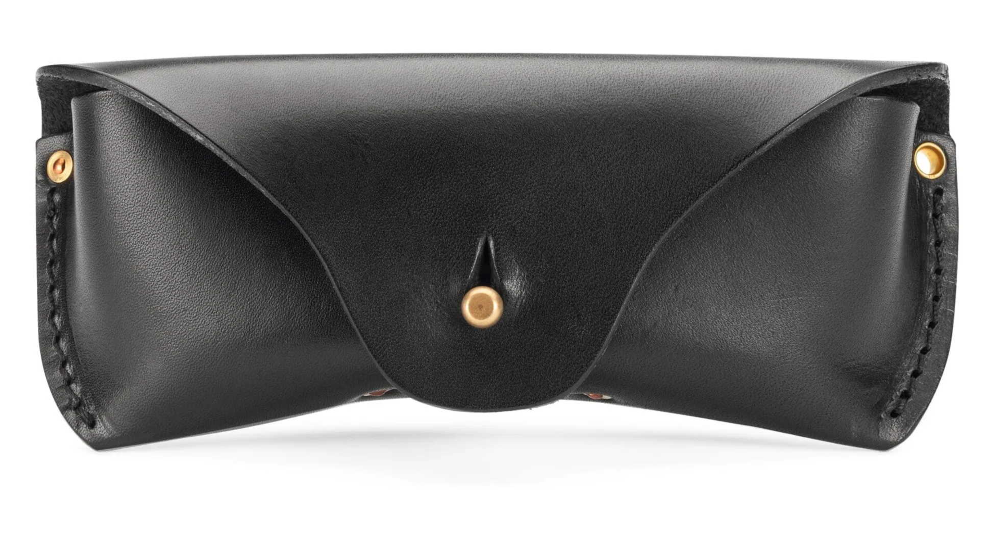 Ein kleines Kunststück ist es, in einer ledernen Hülle fragilen Inhalt vor Stößen und stärkerem Druck gut zu schützen, selbst für solch ein stabiles Brillenetui, das aus ca. 2,5 mm starkem, robustem Rindleder gefertigt ist. Ausnahmsweise nicht auf der Hand, sondern auf der Nase liegt die Lösung für diese Herausforderung – einfach, aber effektiv: Im Innern des Etuis ist im Boden eine „Nase“ vernietet. Dieser feste, wie ein Nasenrücken gewölbte Ledersteg gibt der Brille nicht nur Halt, sondern fungiert vor allem als Abstandhalter und stabilisiert das Etui, wenn es mit Patronentaschenknopf verschlossen wird. Solide vernäht, bewahrt es auch bei stärkerer Beanspruchung Form und Inhalt. Und zugleich ist es geräumig genug, um auch ausladendere Modelle von (Sonnen-)Brillen aufzunehmen. Die Stahlöse am Übergang vom Etuikörper zur Verschlusslasche erlaubt es, ein (Trage-)Band zu befestigen.
