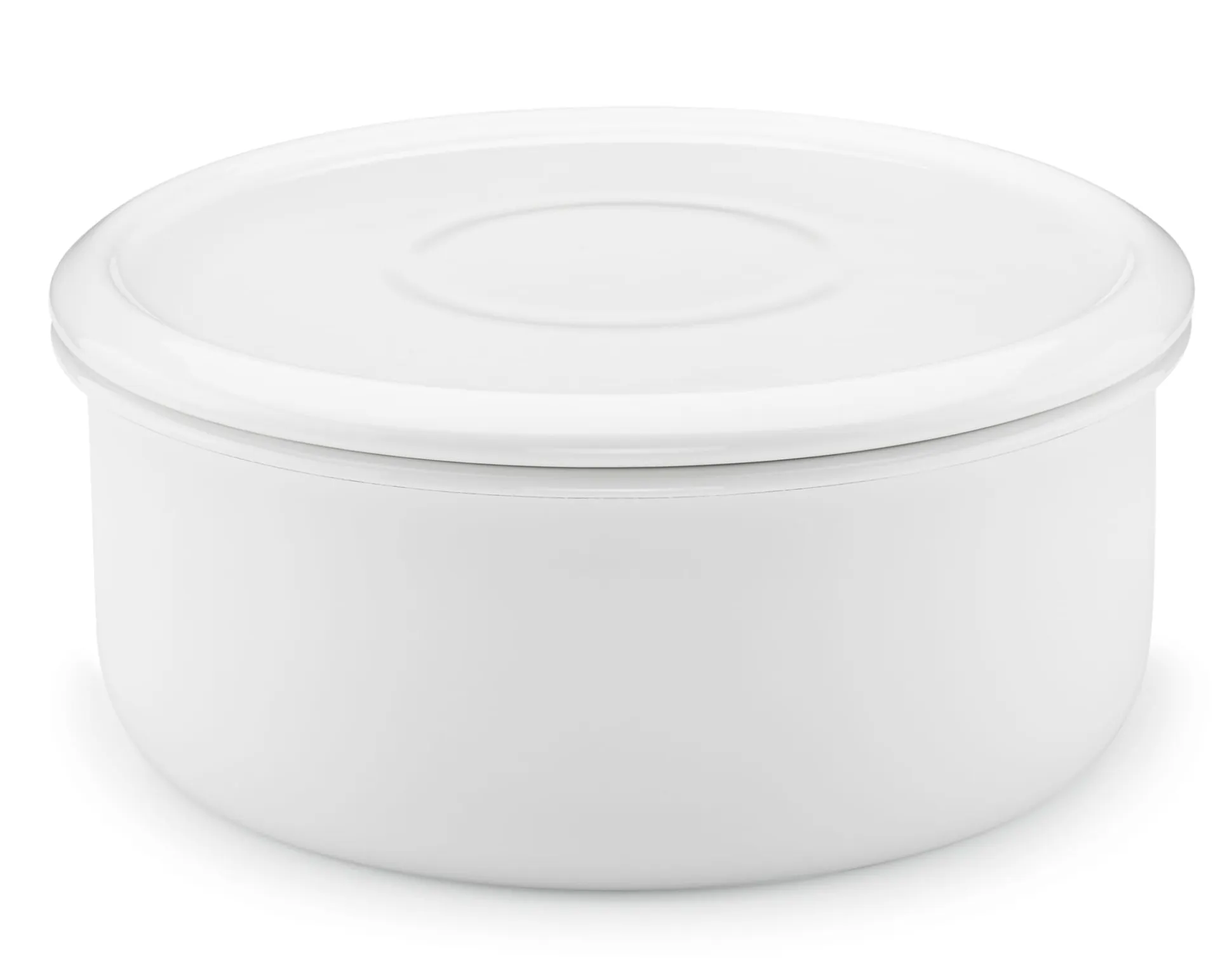Stahlblech weiß emailliert. Volumen 4,5 l, Ø 26 cm, Höhe 11,5 cm. Gewicht 1,1 kg.