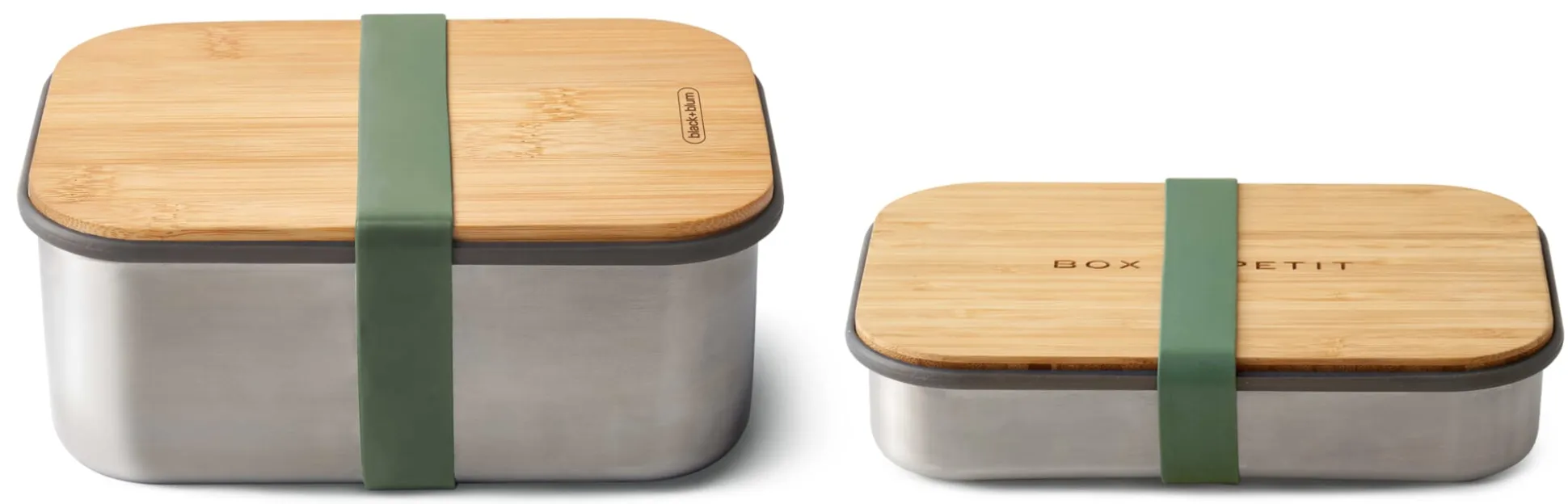 Vom Gummiband gehalten, mit Gummilippe abgedichtet: Edelstahldose mit Holzbrett als Deckel, Schneide- oder Servierbrett. Die Edelstahlbox schützt den Inhalt und das Silikonband bietet zusätzliche Sicherheit.