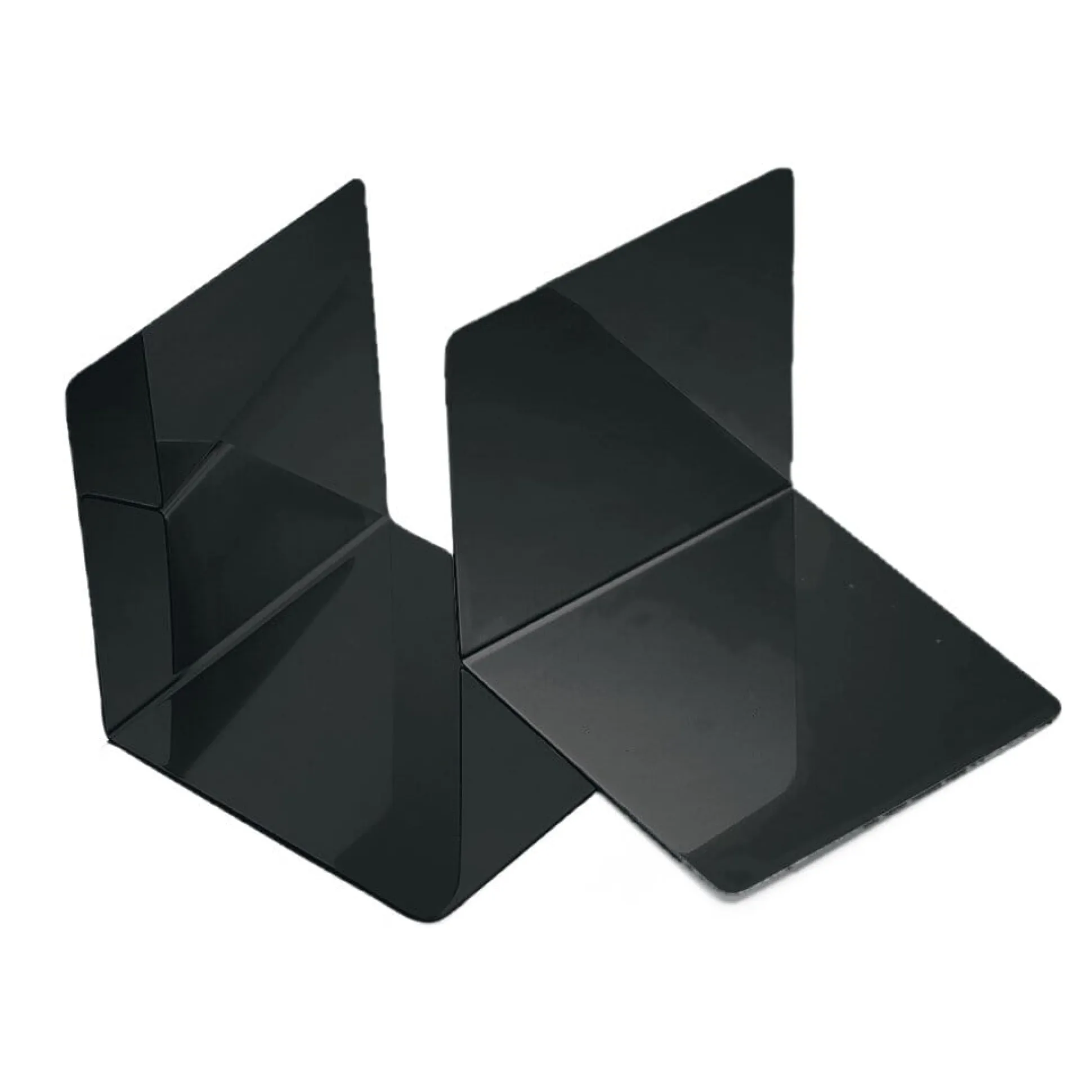 Buchstützen von einfachster Form – abgesehen von ihrer Qualität. Sie sind aus schwarz pulverbeschichtetem Stahlblech mit einer Materialstärke von 1 mm gefertigt, halten also, was Sie ihnen anvertrauen, und nehmen sich doch optisch maximal zurück.