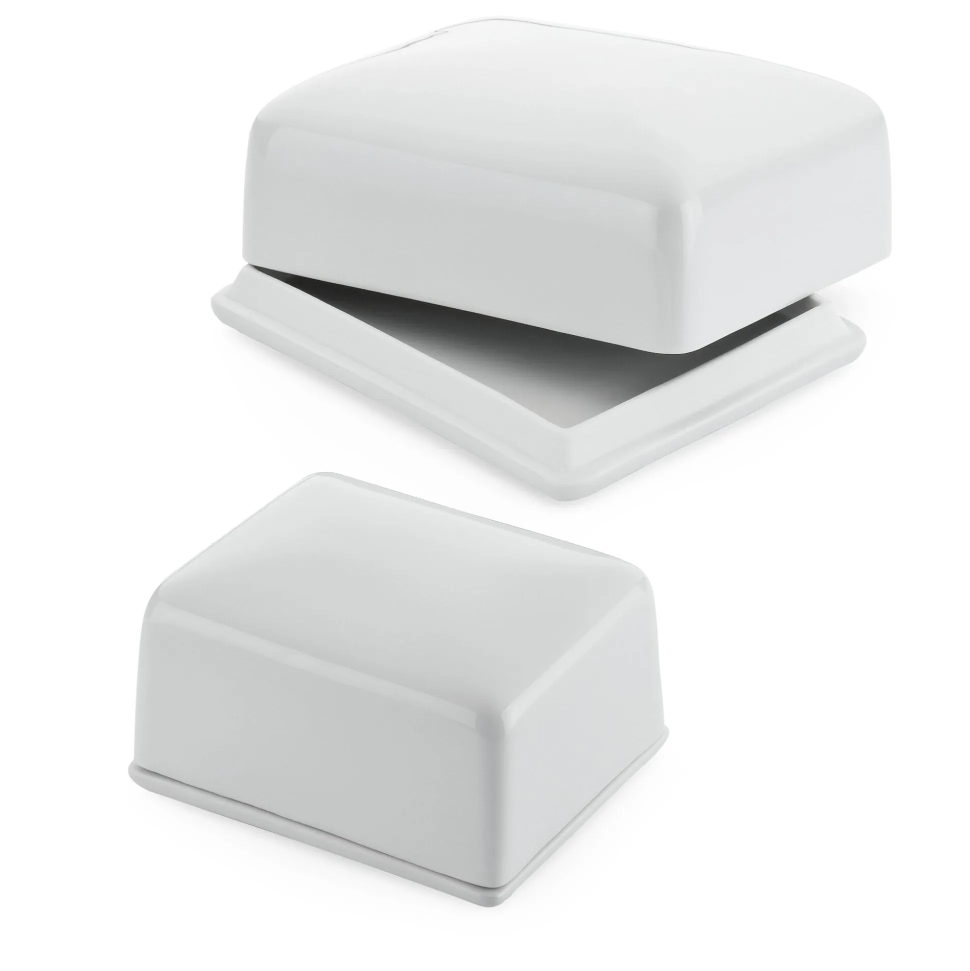Zweiteilig, Unterteil und Deckel aus weißem Porzellan. Die Butterdosen stammen aus handwerklicher Fertigung, bei den angegebenen Maßen handelt es sich um Circa-Maße.