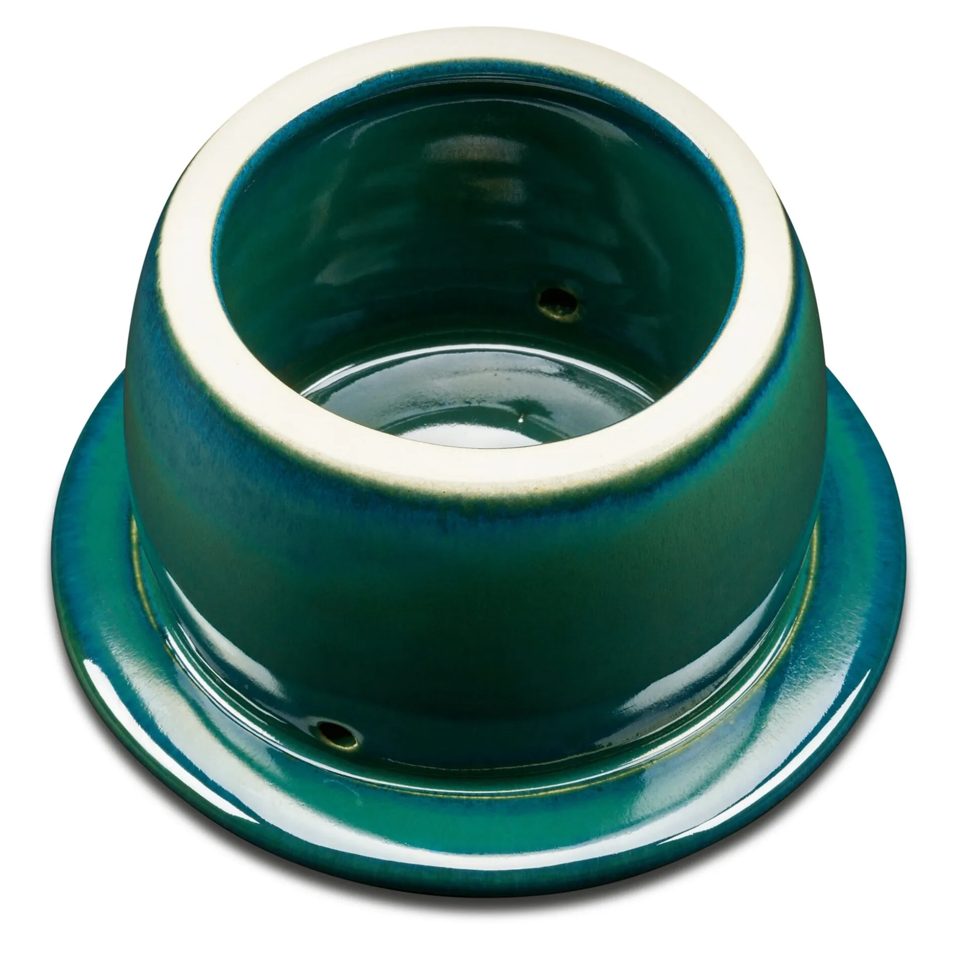 Zweiteilig, aus Westerwälder Feinsteinzeug. Oberteil mit 2 Wasserabflusslöchlein. Gesinterte Keramik, außen und innen grün glasiert. Wir empfehlen, das Wasser im Unterteil der Butterdose etwa alle drei Tage auszutauschen.