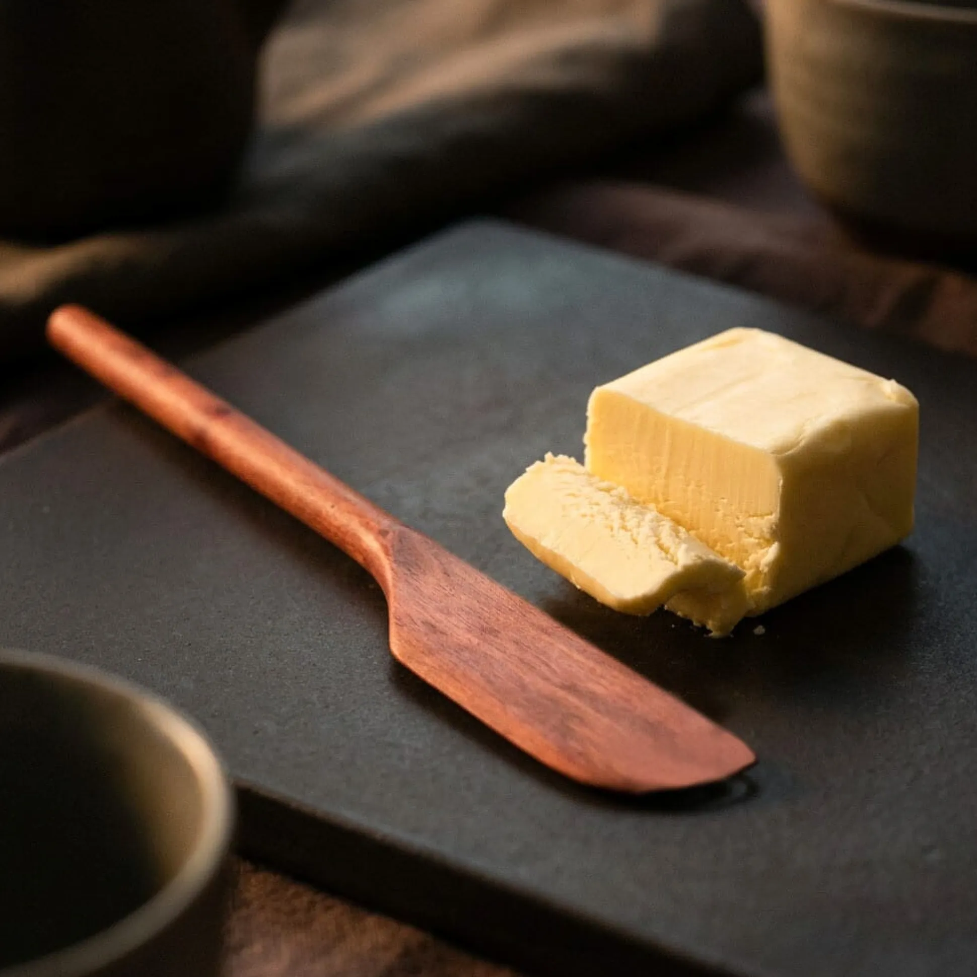Gute Butter verdient den Respekt besseren Werkzeugs. Wir empfehlen dieses handwerklich aus dem besonderen Holz der Elsbeere gefertigte Buttermesser, dessen elegante Form dem Schwung der Bewegung beim Verstreichen folgt. Das kleine Messer wird aus einem Stück geschnitten, geschliffen, gewässert und nach dem Wässern ein weiteres Mal geschliffen. So wird auch die natürliche Maserung des Holzes mit seinem warmen Farbton schön hervorgehoben. Vorteil Elsbeere: Feinporig und von ausgesprochener Dichte, eignet sich das Holz auch aus hygienischen Gründen perfekt für die Verwendung in der Küche und bei Tisch. In dieser Form bekommen Sie das Buttermesser nur bei uns.