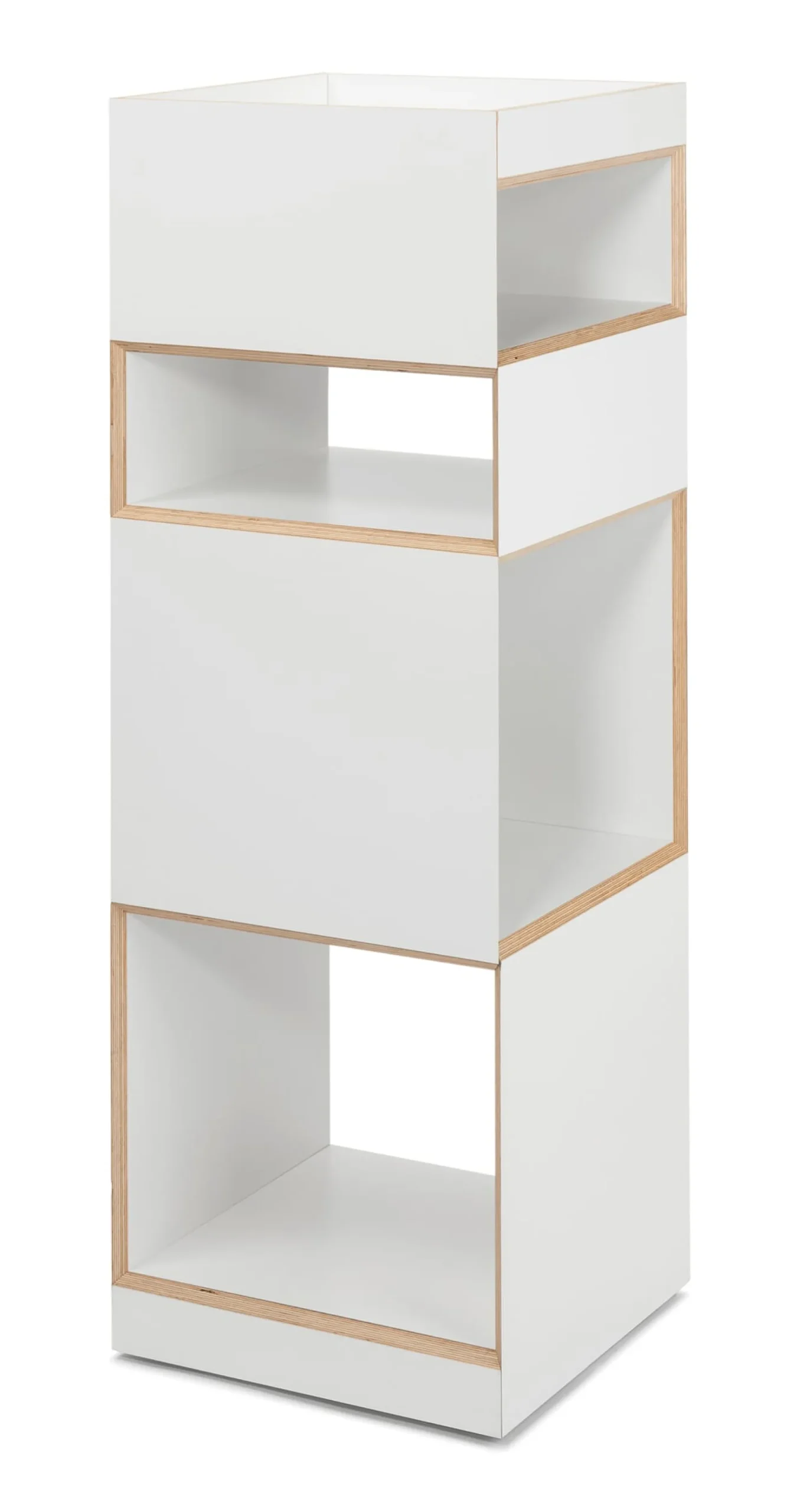 Der große Regalturm der Serie mit zwei hohen und zwei flachen Fächern sowie einer Schale am oberen Ende. Leicht zu bewegen auf verdeckt montierten, freidrehenden Rollen. Die Lieferung erfolgt montiert.