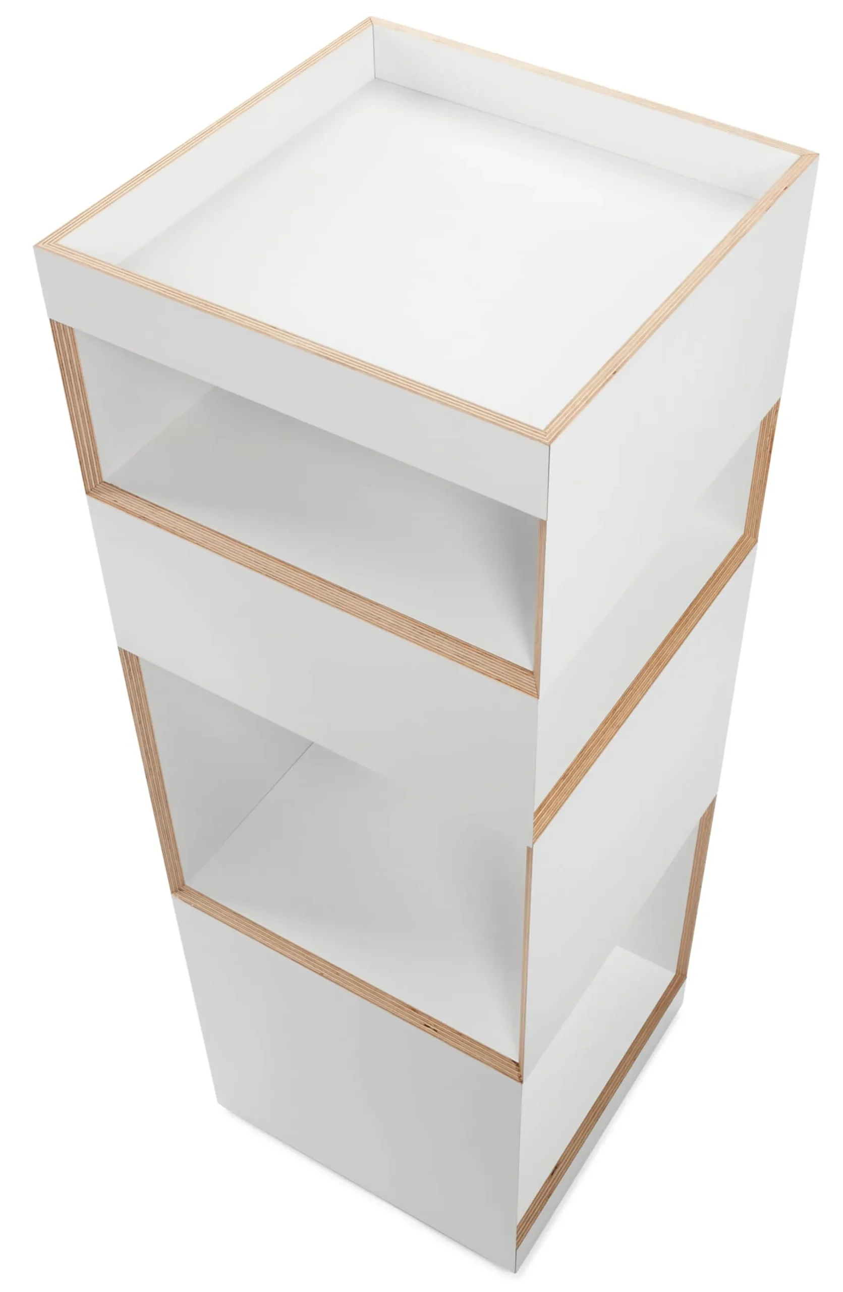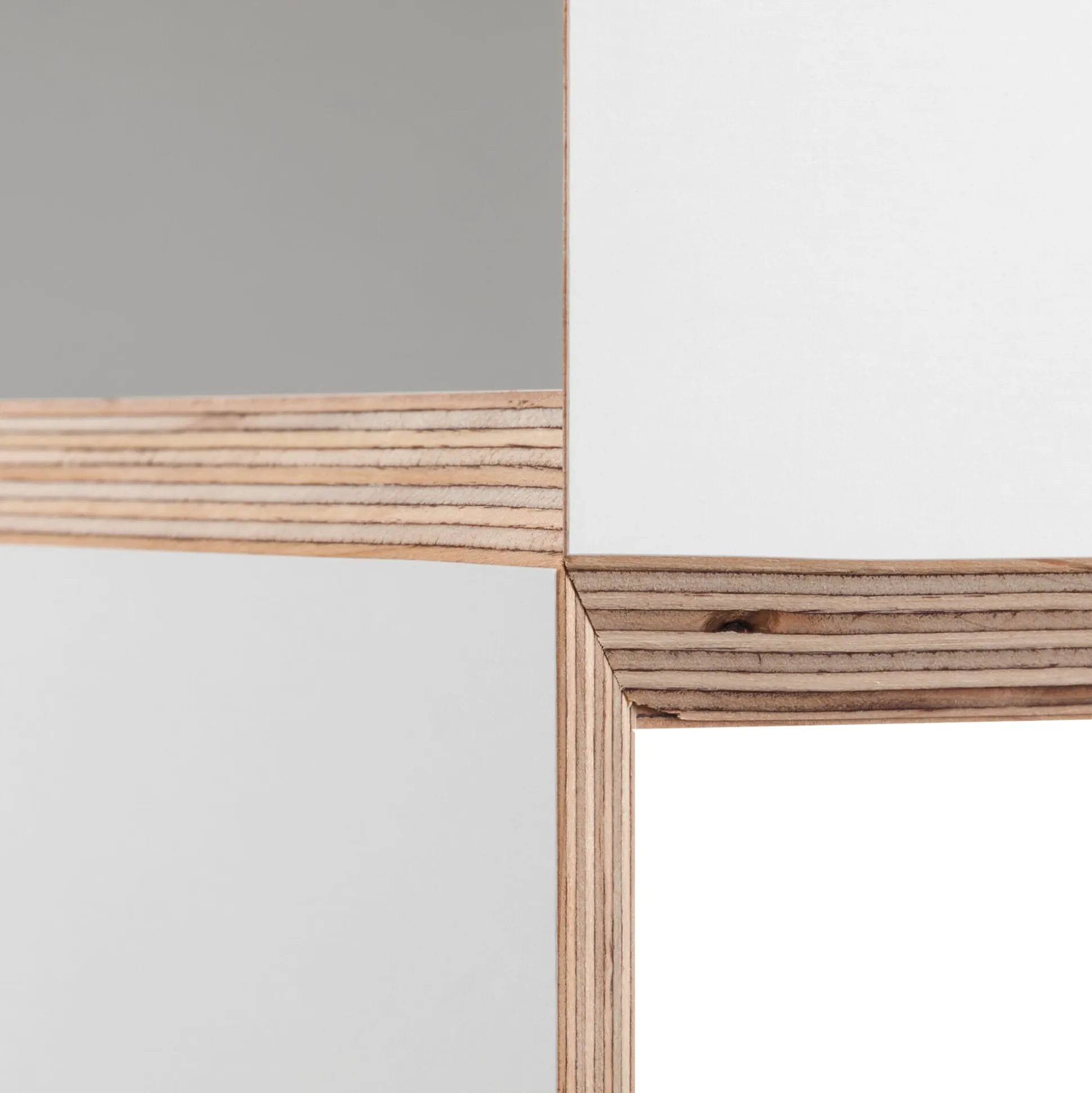 Material: Birke Multiplex (Herkunft: Osteuropa), 12 mm, beidseitig weiß melaminharzbeschichtet (Bei den aus dem Karosseriebau stammenden Multiplexplatten sind Farb- und Strukturunterschiede sowie vereinzelt kleine Druckstellen möglich.)