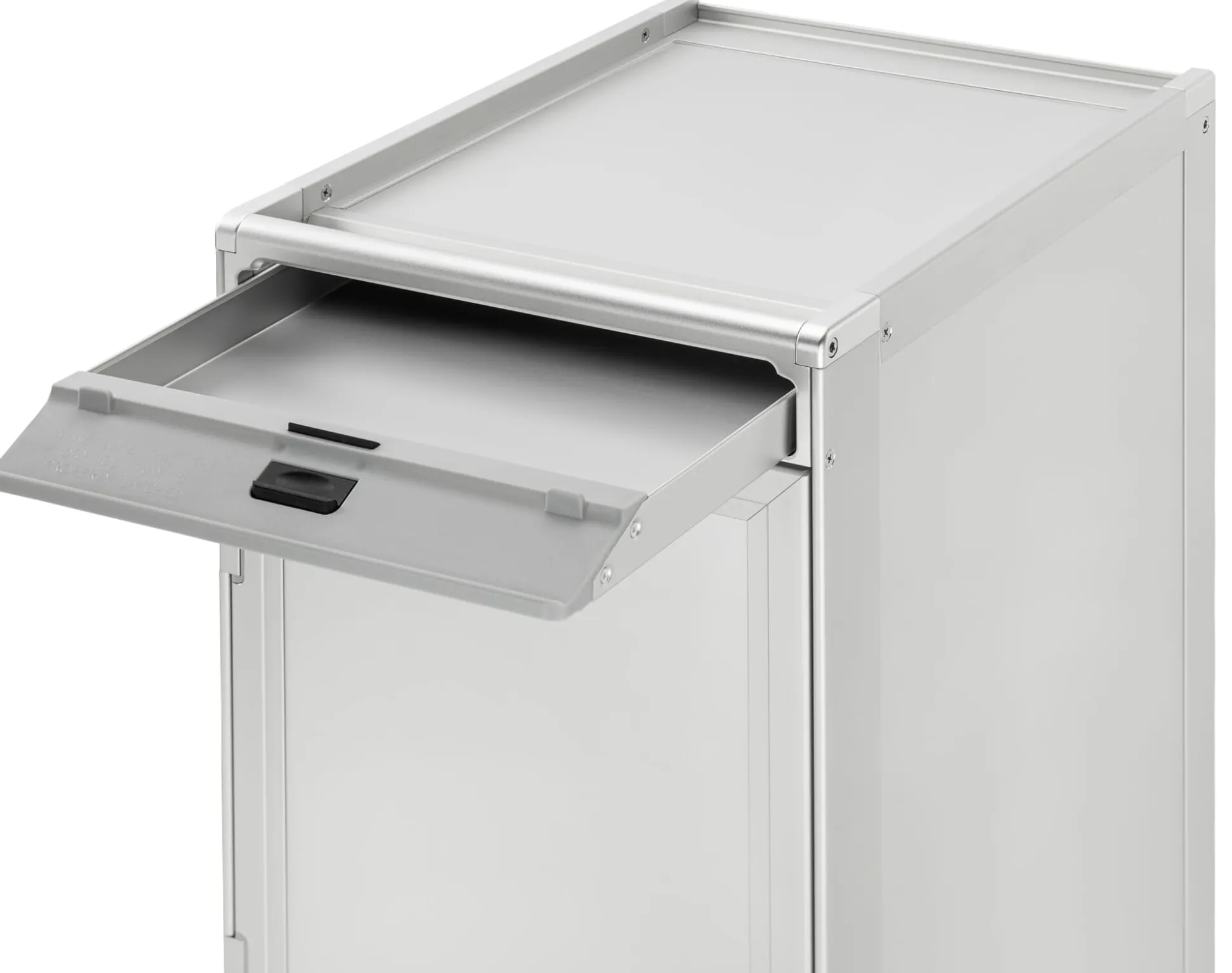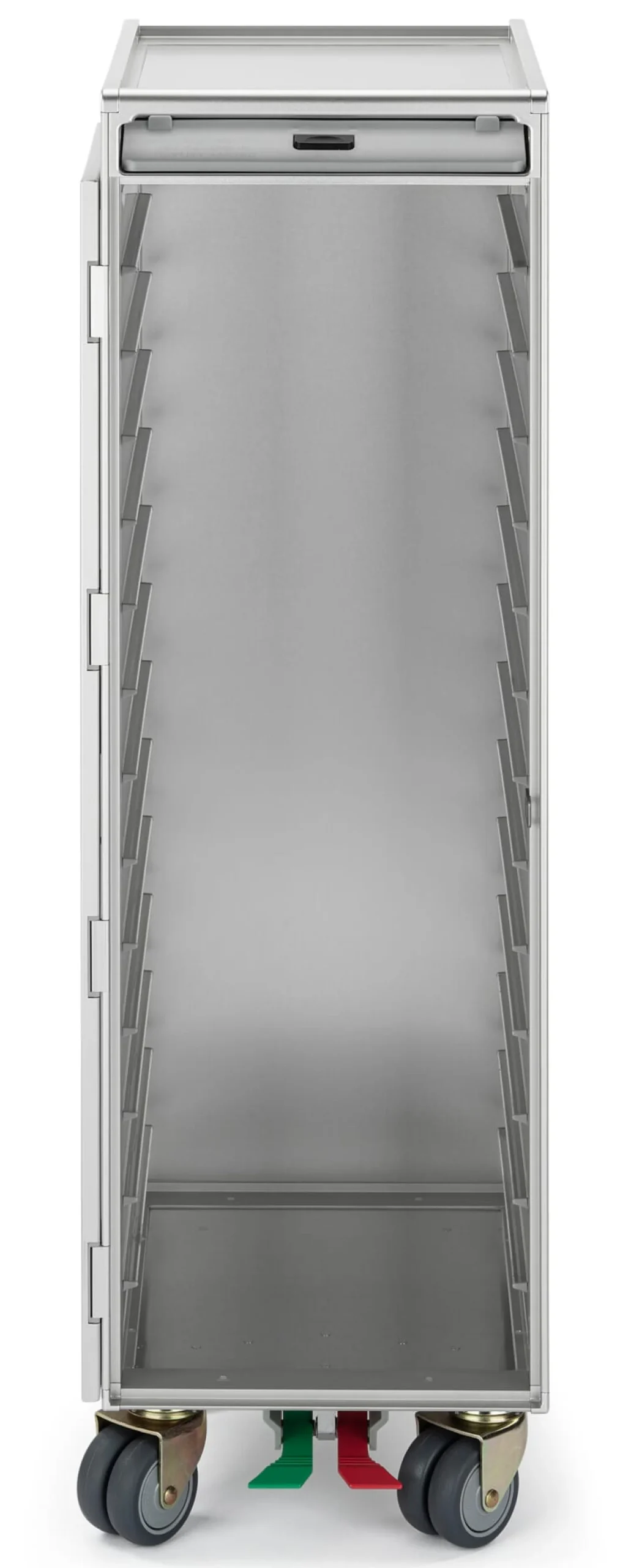 Umlaufende Aluminiumprofile, robuste Schließriegel aus Edelstahl und Industrierollen mit Fußfeststellbremsen sind Merkmale der industriellen und funktionalen Bauweise.
