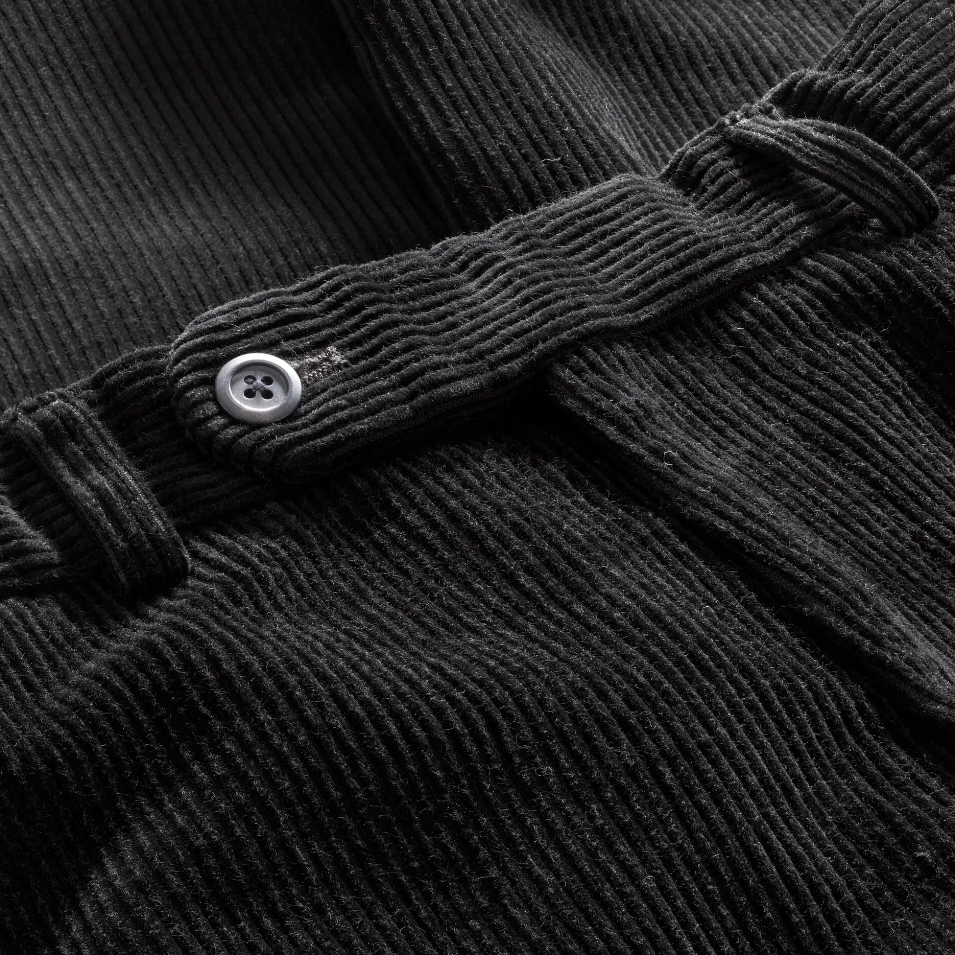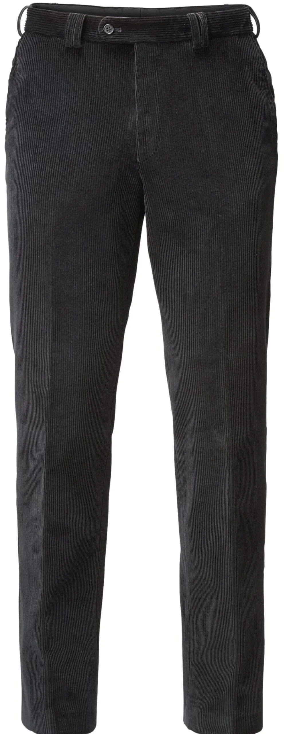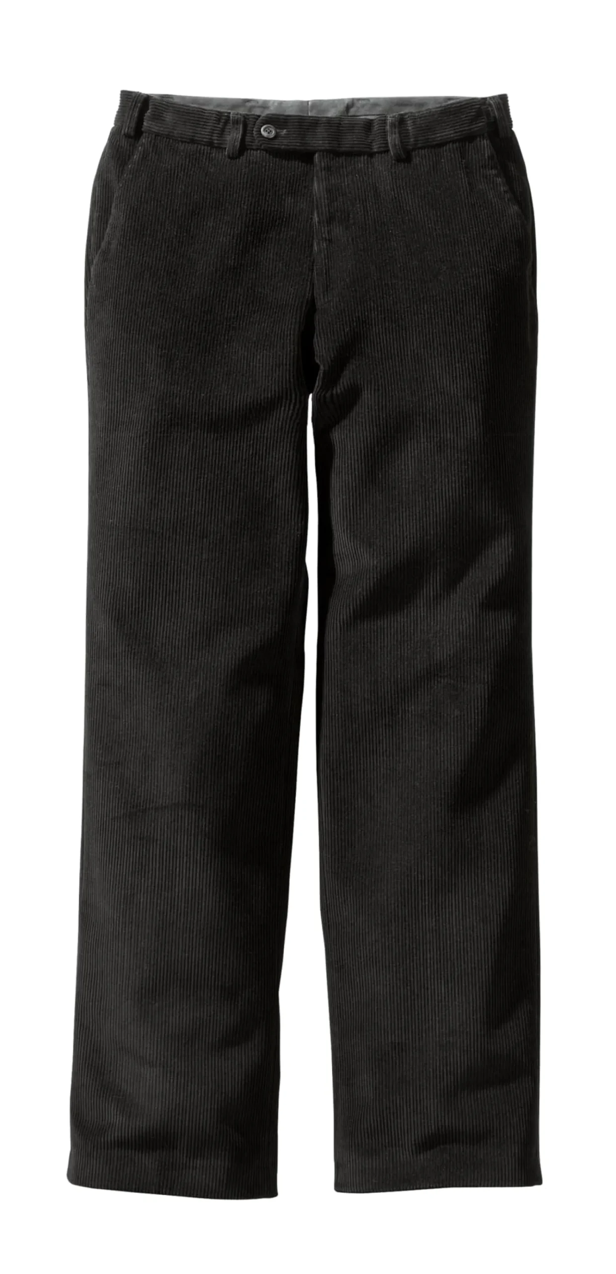 Aus diesem Cord wird üblicherweise Berufsbekleidung gefertigt – extremer Beanspruchung hält das unanfällige Material bestens stand. In der Kette kommt ein kräftiger Zwirn zum Einsatz; im Zusammenspiel mit der hohen Schussfadendichte – 55 Fäden pro Zentimeter – entsteht ein schwergewichtiges, sehr belastbares Gewebe (500 g/qm) von hoher Florfestigkeit. Diese ergibt sich zum einen aus der Art der Verankerung des Florfadens im Gewebe – aus der sogenannten VW-Bindung – und zum anderen aus der großen Anzahl Schussfäden. Herrenhosenspezialist Hiltl lässt daraus in Rumänien diese mäßig weite Herrenhose ohne Bundfalte und Aufschlag konfektionieren. Der seitliche Dehnbund ist mit Oberstoff gedoppelt. Die Hose ist mit französischen Seitentaschen und zwei paspelierten Gesäßtaschen mit Echthornknöpfen ausgestattet.