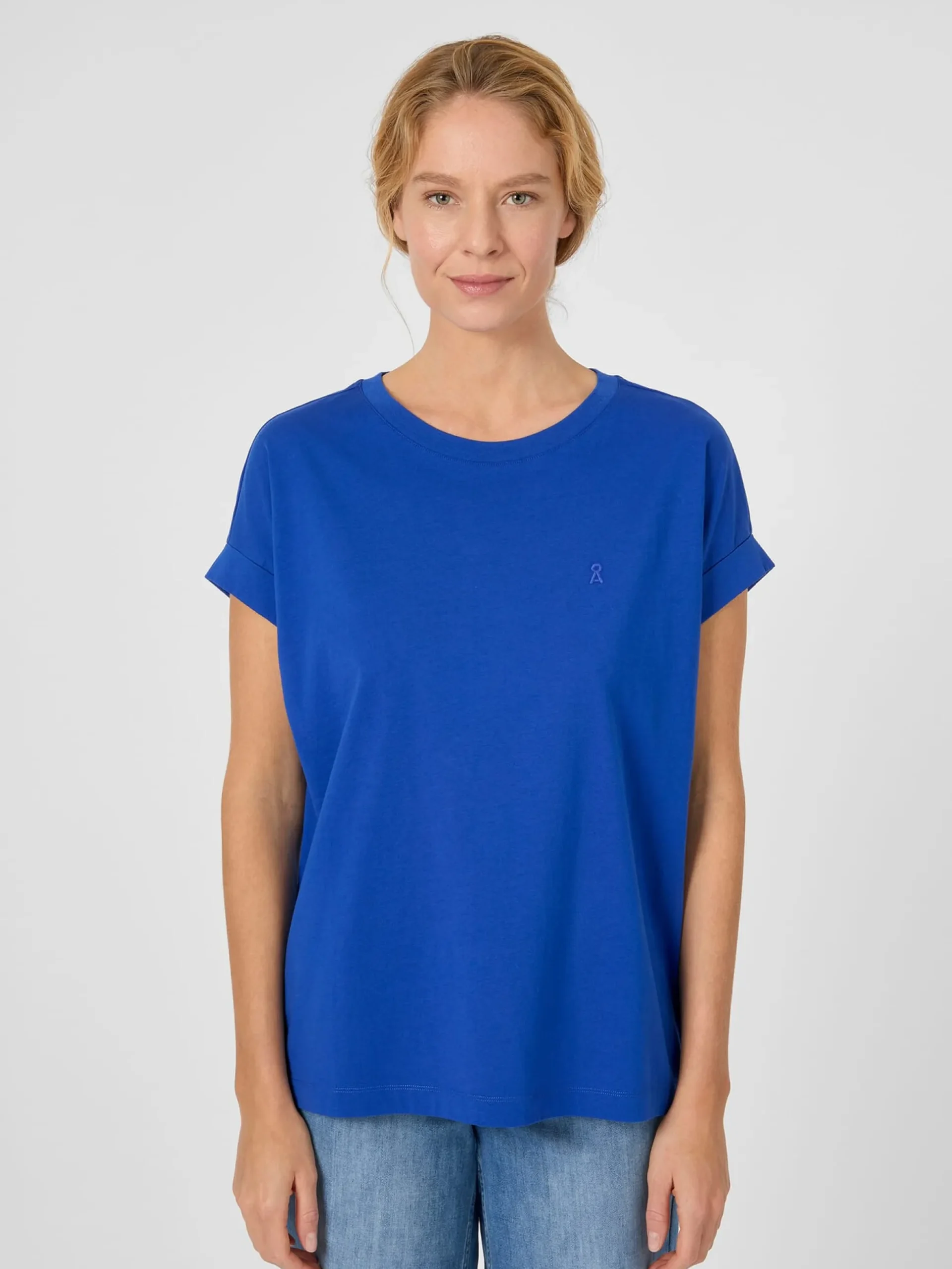 Klassisches Basisstück, das die Sommergarderobe vielseitig ergänzt. Das Shirt ist im Loose-Fit-Schnitt gearbeitet, also in lockerer Passform, die der Beweglichkeit entgegenkommt. Es ist mit Ärmelblenden ausgestattet, die verwendete Baumwolle stammt aus kontrolliert biologischem Anbau.