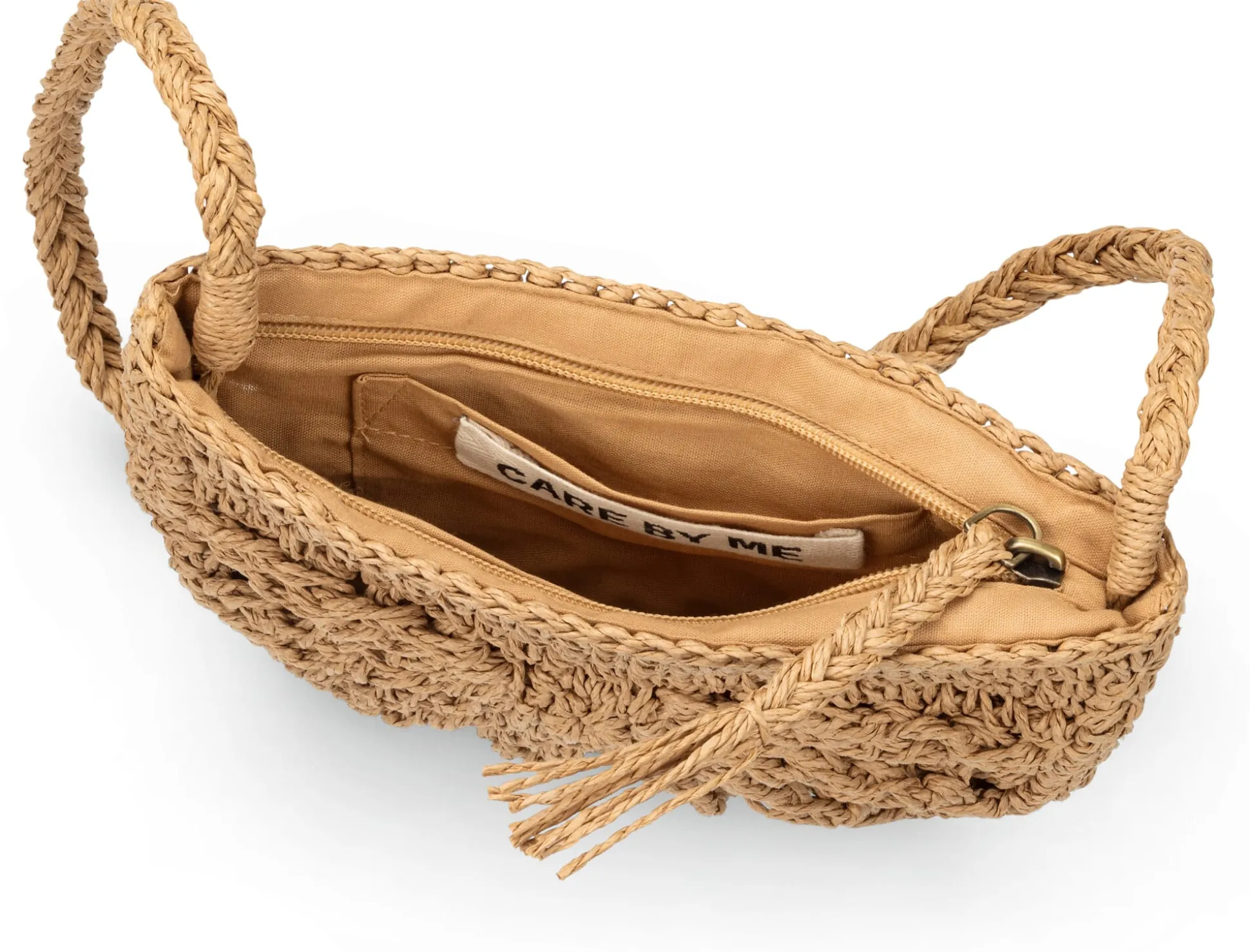 Die sommerliche Leichtigkeit des Boho-Chic, die Strapazierbarkeit einer Naturfaser und die Qualität des überlieferten Handwerks – gleich drei vorteilhafte Eigenschaften verbindet diese Handtasche entspannt-stilvoll miteinander. Kunstfertig wird sie von Hand aus den Blattfasern der Raphia-Palme gehäkelt. Raffiafasern sind robust und zugleich leicht formbar, und vor allem gehäkelt (wie der Korpus) oder geflochten (wie der Trageriemen) fügt sich Raffia zu einer sehr reißfesten, tragfähigen Struktur mit natürlichem Look. Letzterer unterstreicht leicht und leger das Boho-Design mit seinen typischen Quasten und Tasseln. Die festen Maschen der Kanten und des oberen Taschenrandes sichern der Handtasche ihre Halbmondform und Stabilität und bilden einen feinen Kontrapunkt zum erhaben strukturierten, radial aufgebauten Strahlenmuster des Korpus. Die Länge des Trageriemens ist optimal, um die Tasche leger crossbody tragen zu können, während sie, mit einem Bio-Baumwollgewebe in robuster Leinwandbindung gefüttert, geschmeidig Ihre Essentials bewahrt.