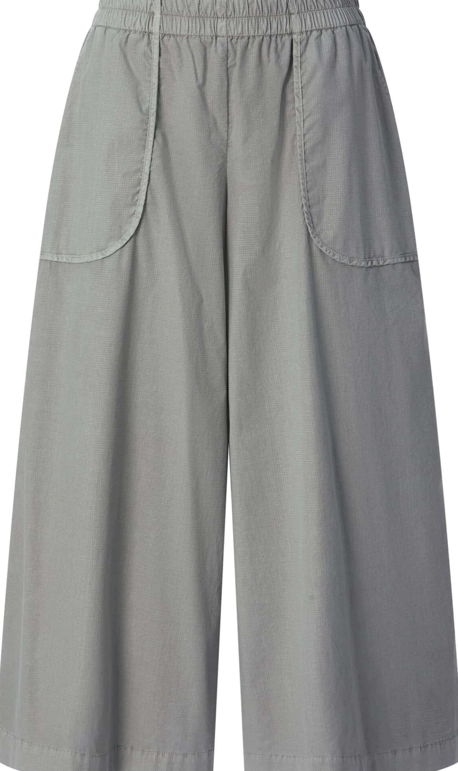 Ripstop ist ein robuster und reißfester Stoff mit charakteristischem Gittermuster, was dadurch entsteht, dass in regelmäßigen Abständen dickere Kett- und Schussfäden in das Gewebe eingearbeitet werden. Meist wird der Stoff, der aufgrund seiner Strapazierbarkeit im Outdoorbereich sehr beliebt ist, aus reinen Kunstfasern hergestellt. Für diesen verschlusslosen Hosenrock verwendet Oska einen Ripstop aus hautsympathischer Baumwolle und einem geringen Anteil Elastan zugunsten der Elastizität. Das Gewebe ist leicht und trägt nicht auf und die bequeme Passform mit geradem, weitem Bein und Gummibund sorgt für viel Bewegungsfreiheit. Die aufgesetzten Seitentaschen sind sauber paspeliert.