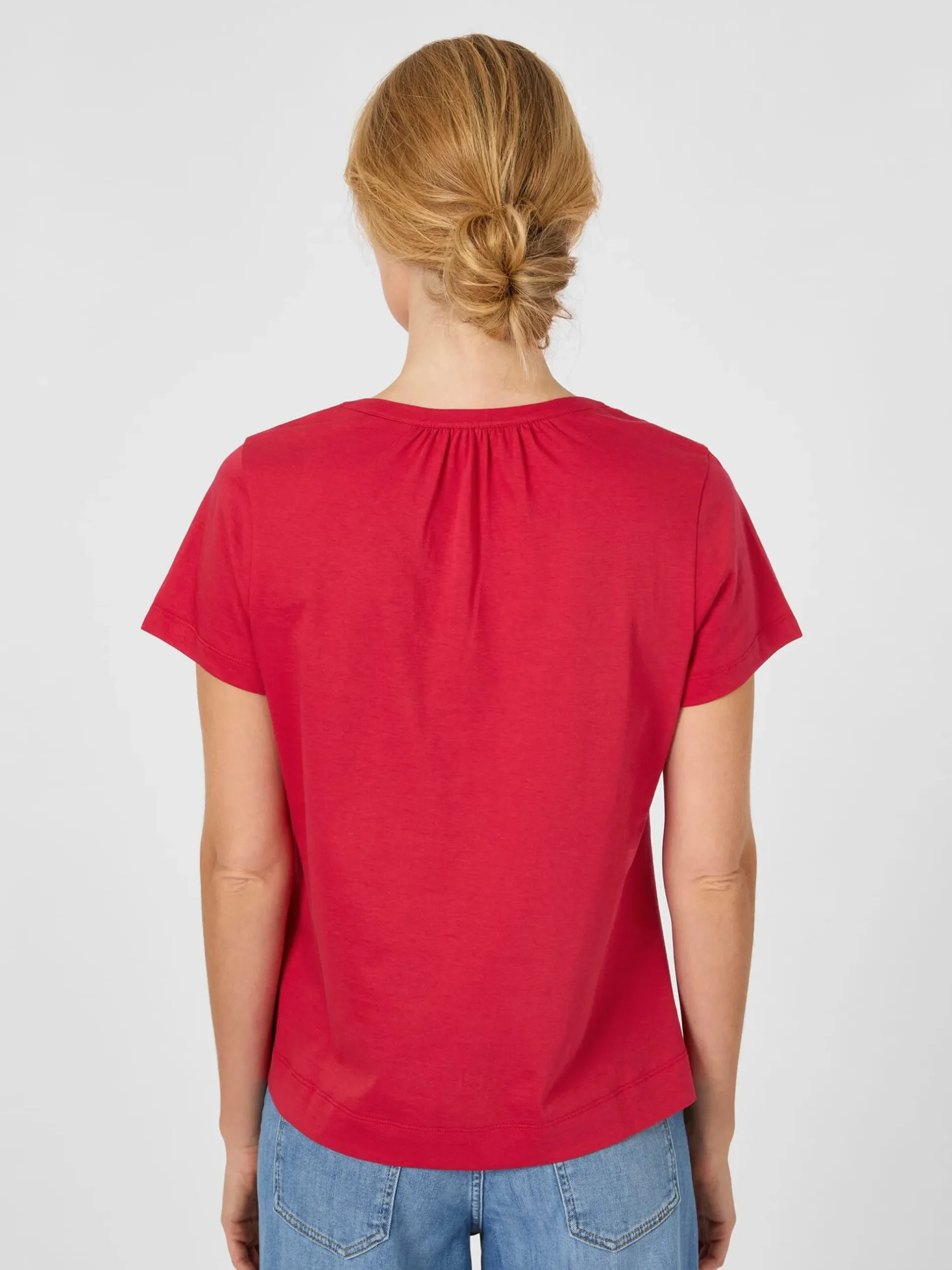Den feinen Jersey dieser Bluse konfektioniert Alma & Lovis aus reiner, hautsympathischer Bio-Baumwolle. Sie wird in Griechenland kontrolliert biologisch angebaut, dort versponnen und weiterverarbeitet, was kurze Wege innerhalb des Produktionsprozesses schafft. Die Bluse liegt leicht und schmiegsam auf der Haut und hat einen weichen Fall. Geschnitten ist sie in legerer, leicht ausgestellter Passform, mit V-Ausschnitt und kurzen Ärmeln. Die gerafften Partien am Ausschnitt und im Nacken sorgen für einen femininen Look.